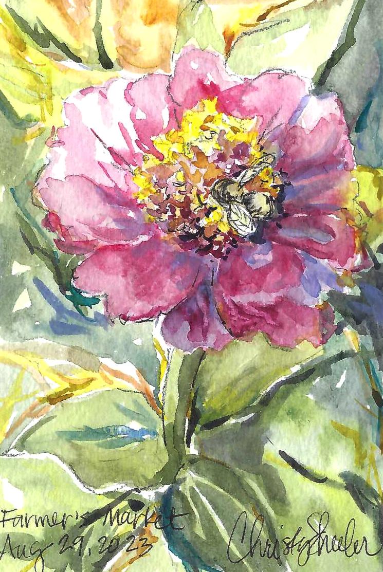 A watercolor piece I began to create while set up at our local farmer's market in the park. At the bottom is note of its start on August 29th. Working from a photo on my phone, I first placed down a quick pencil sketch. Working from my travel kit and then later completing in the art studio, this zinnia is solo with a bee at the center.