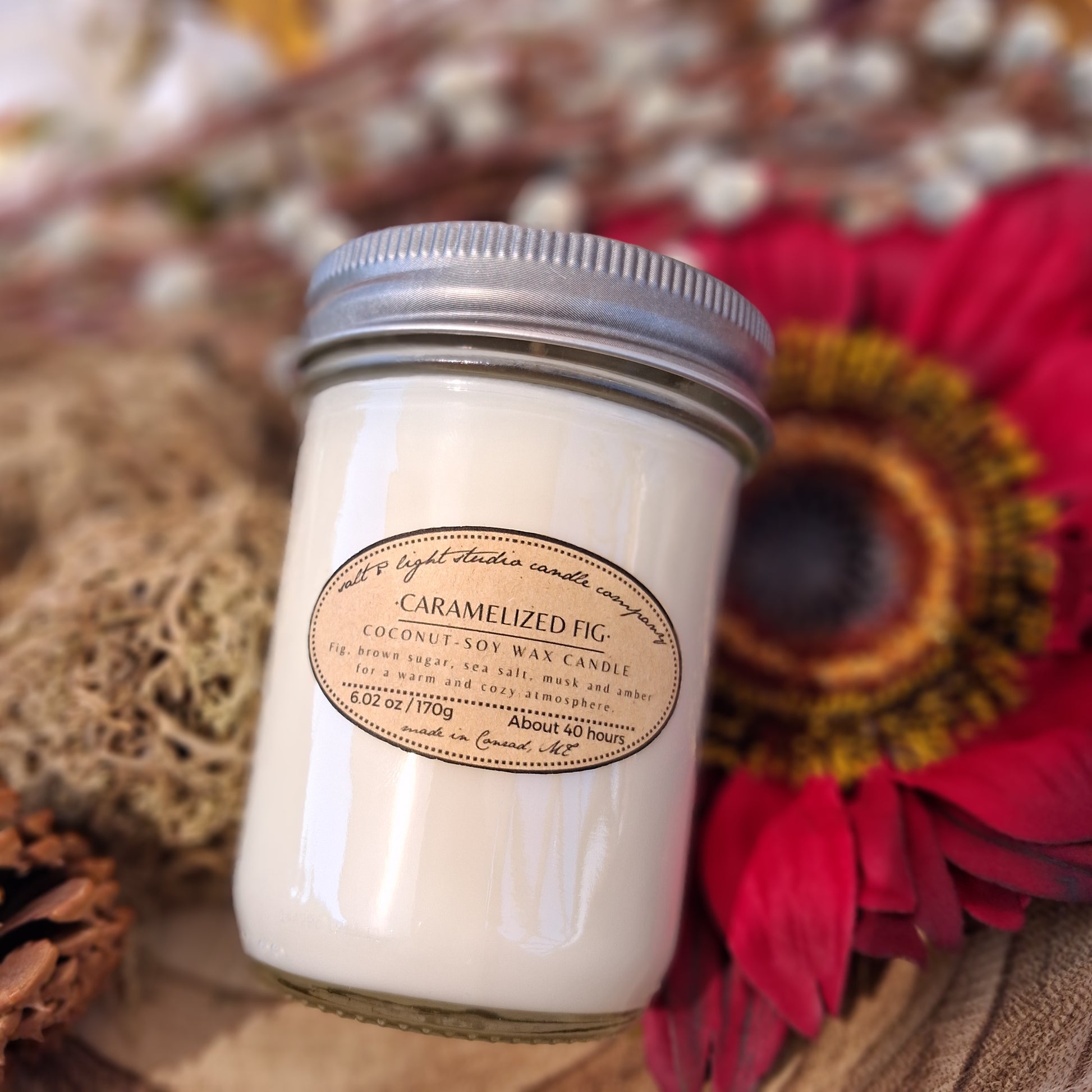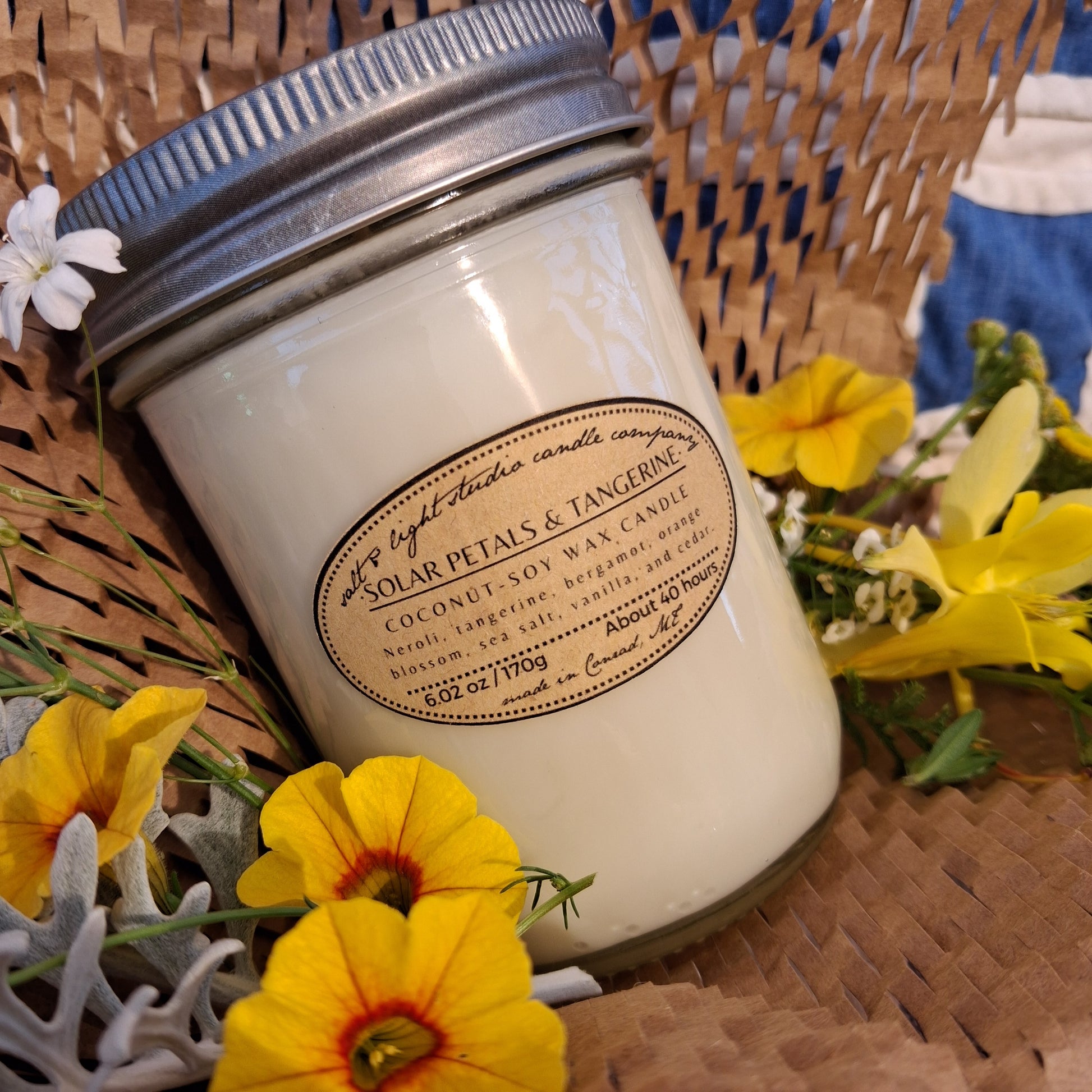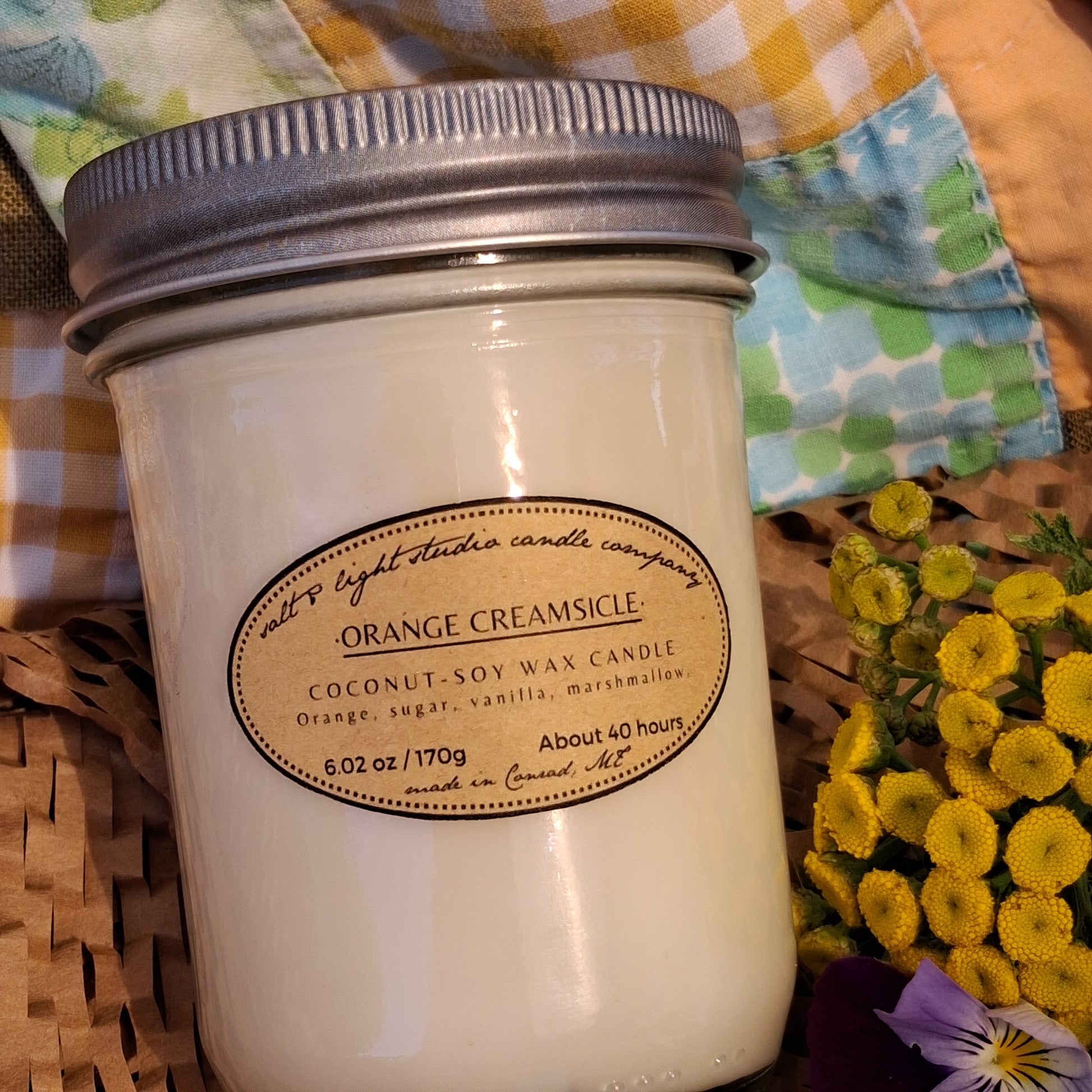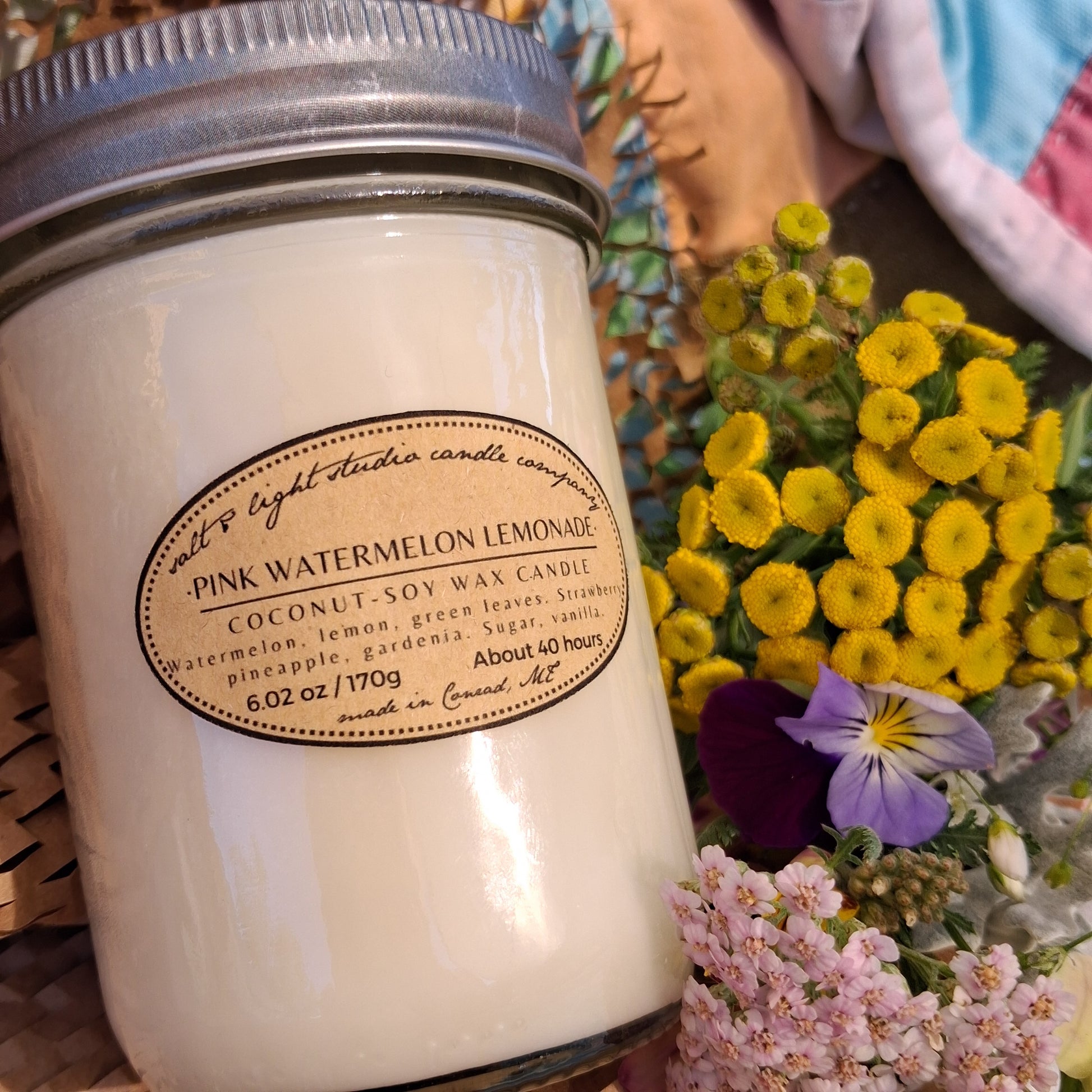 Scented coconut soy wax with braided cotton wick. Half-pint glass jar with lid.