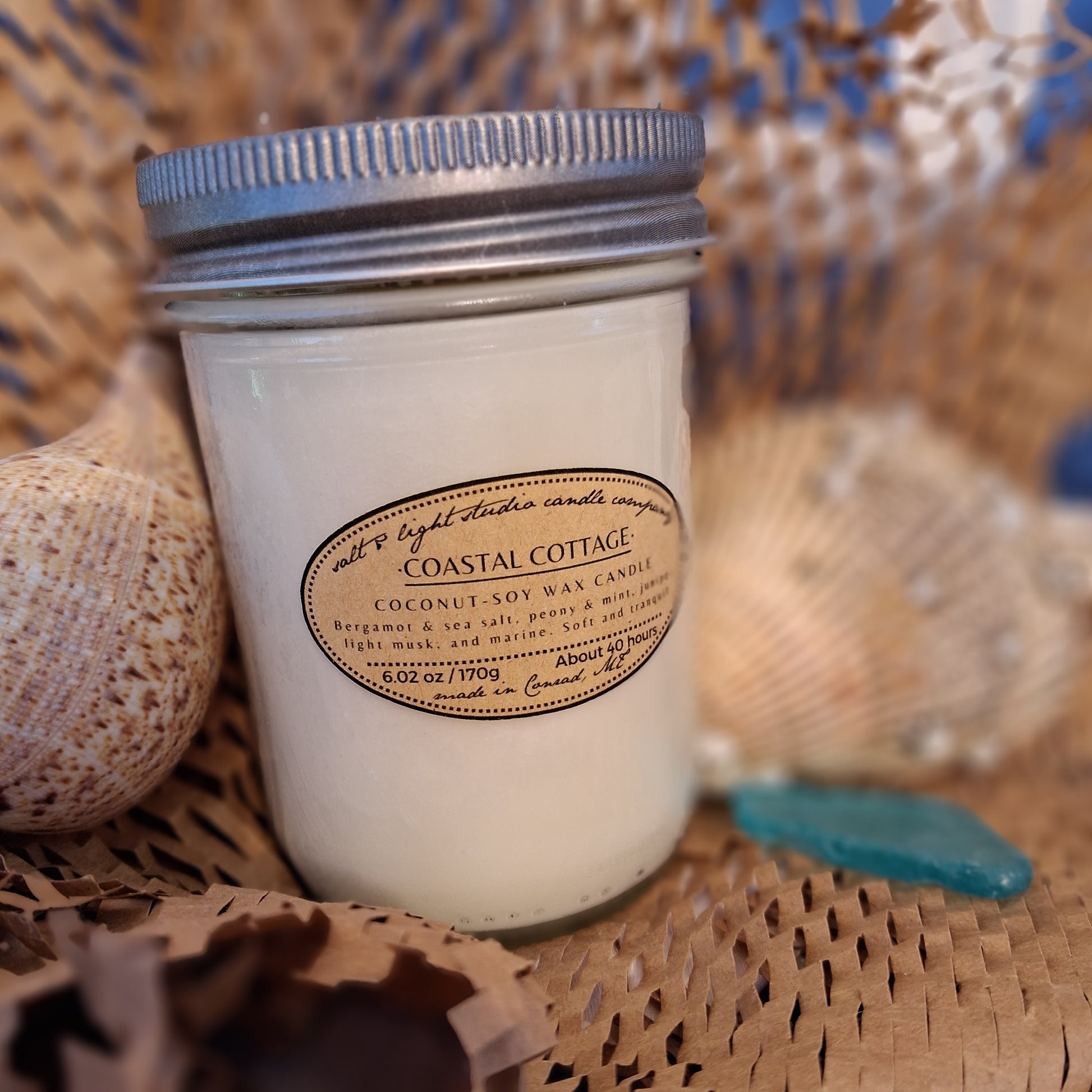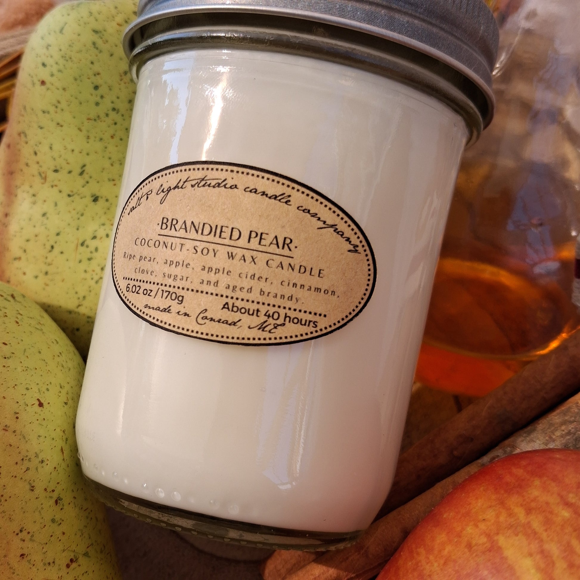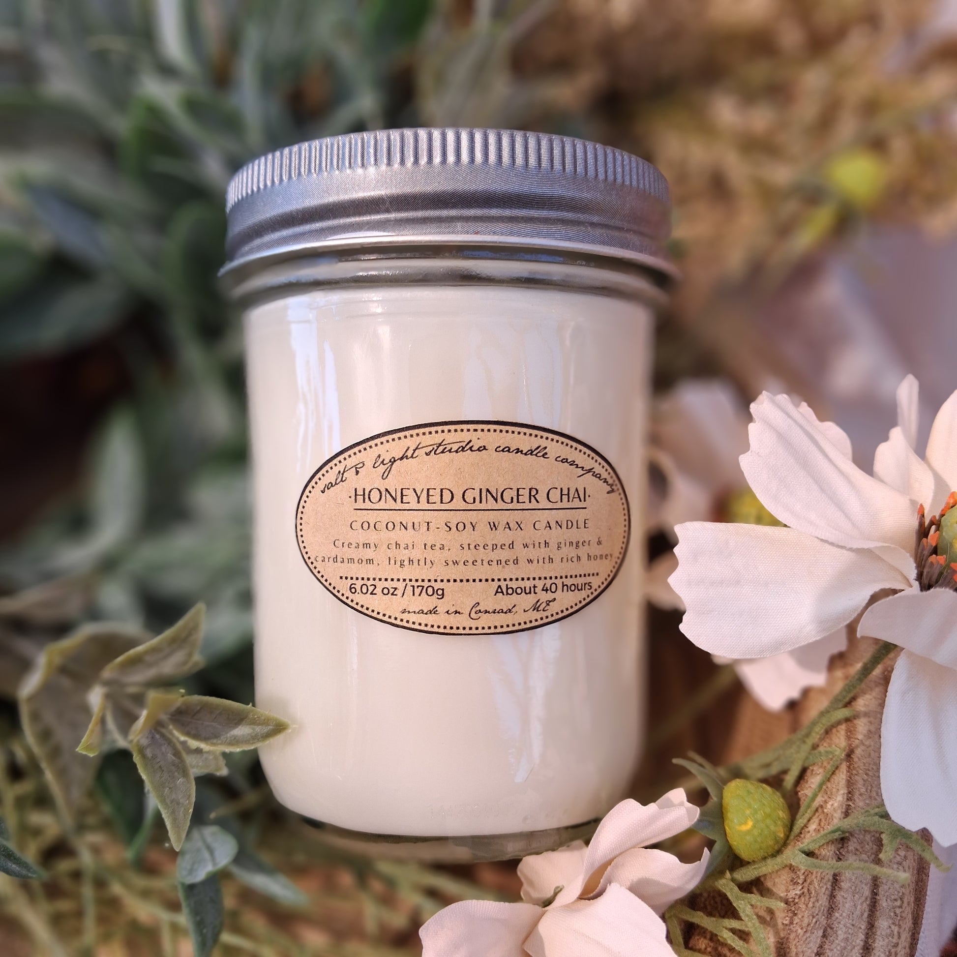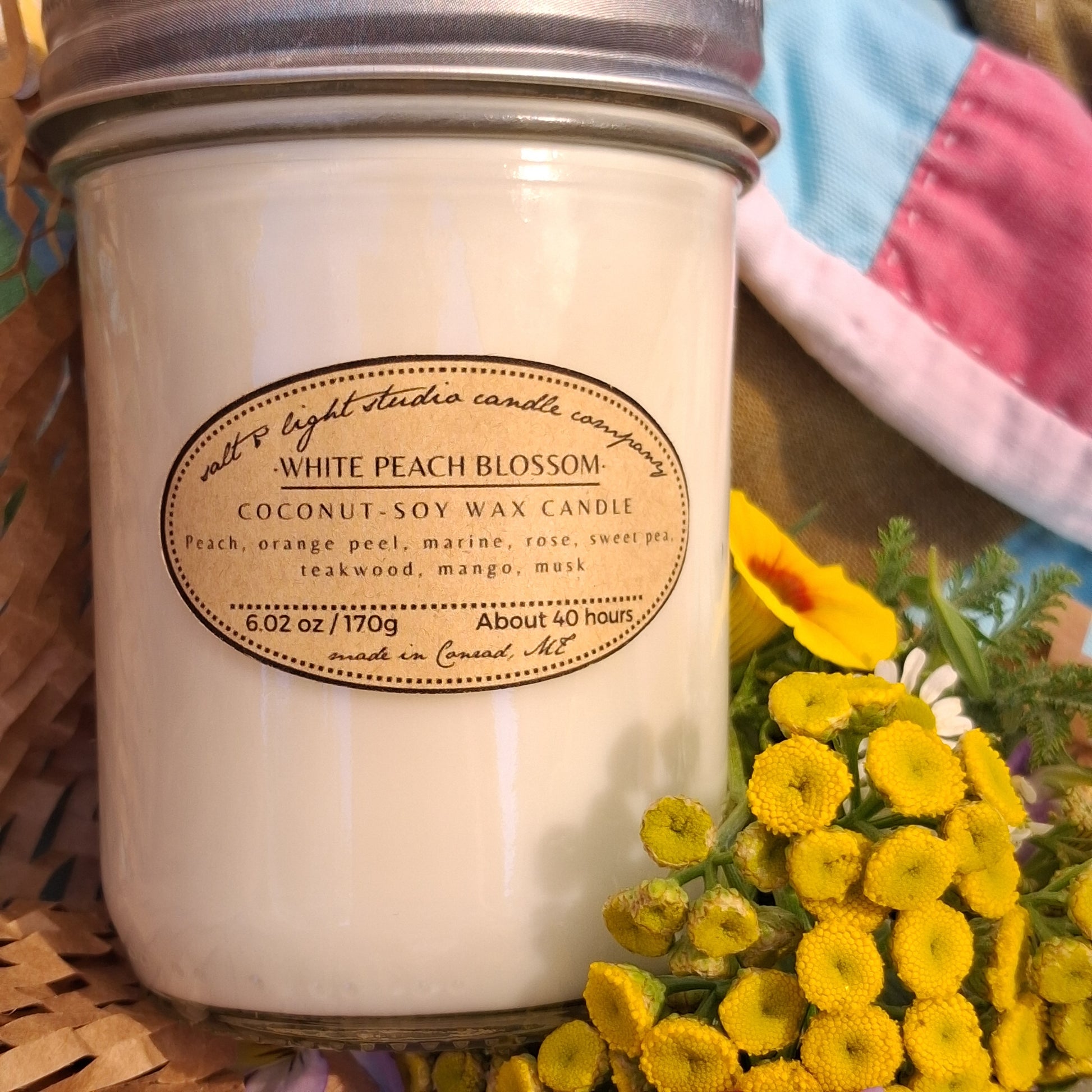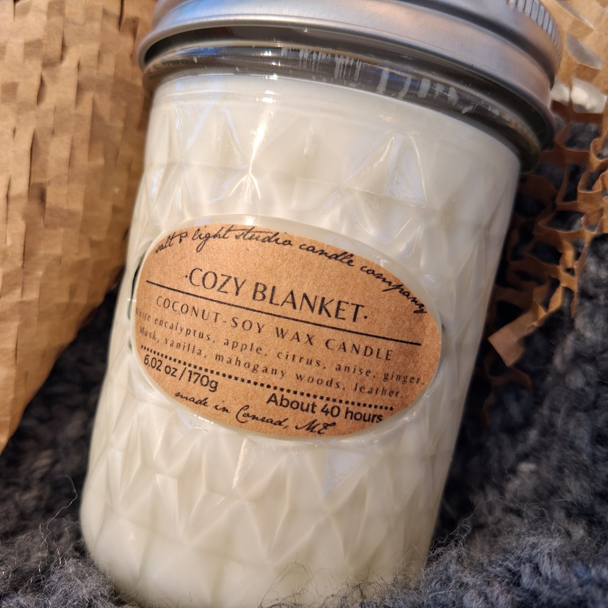 Scented coconut soy wax with braided cotton wick. Half-pint glass jar with lid.