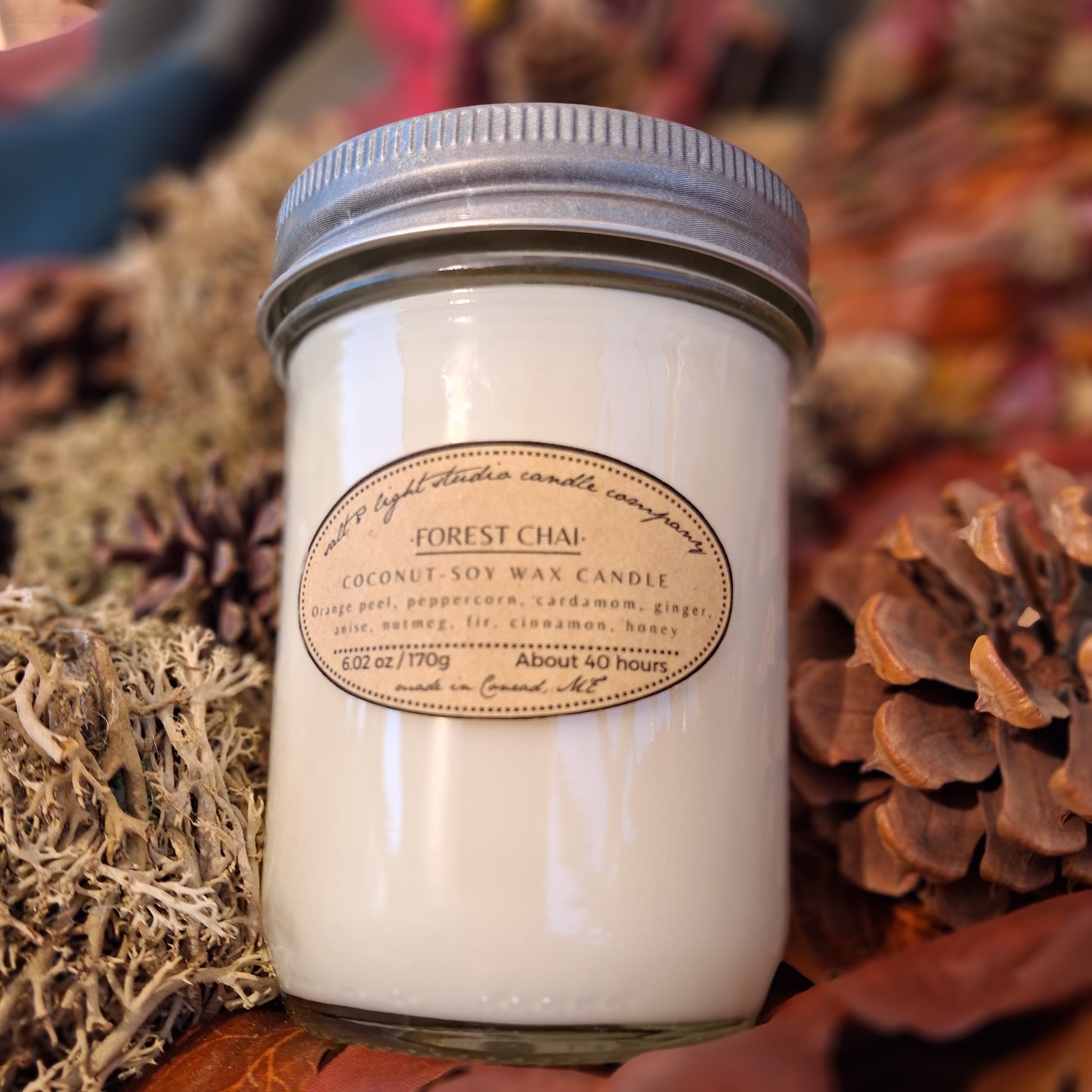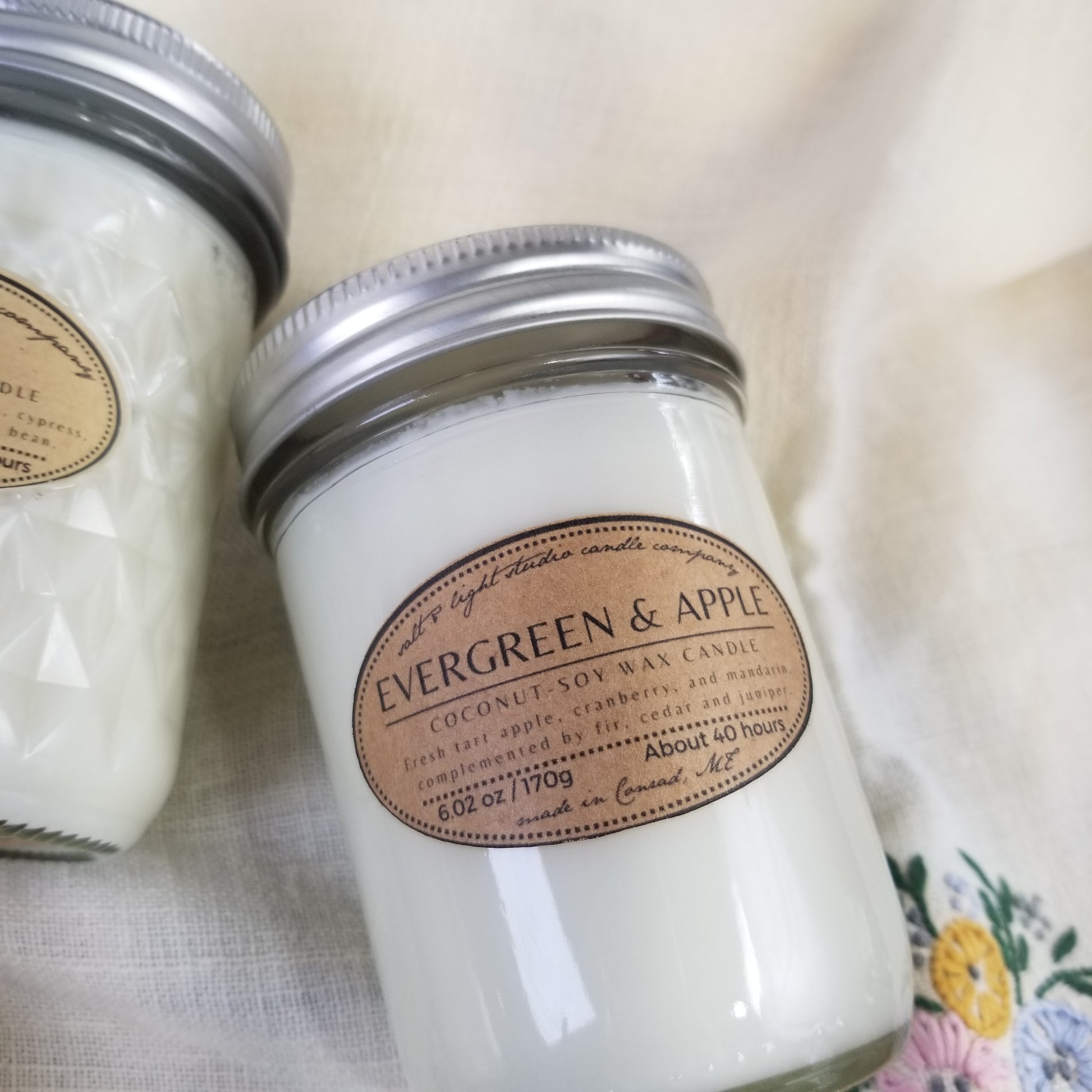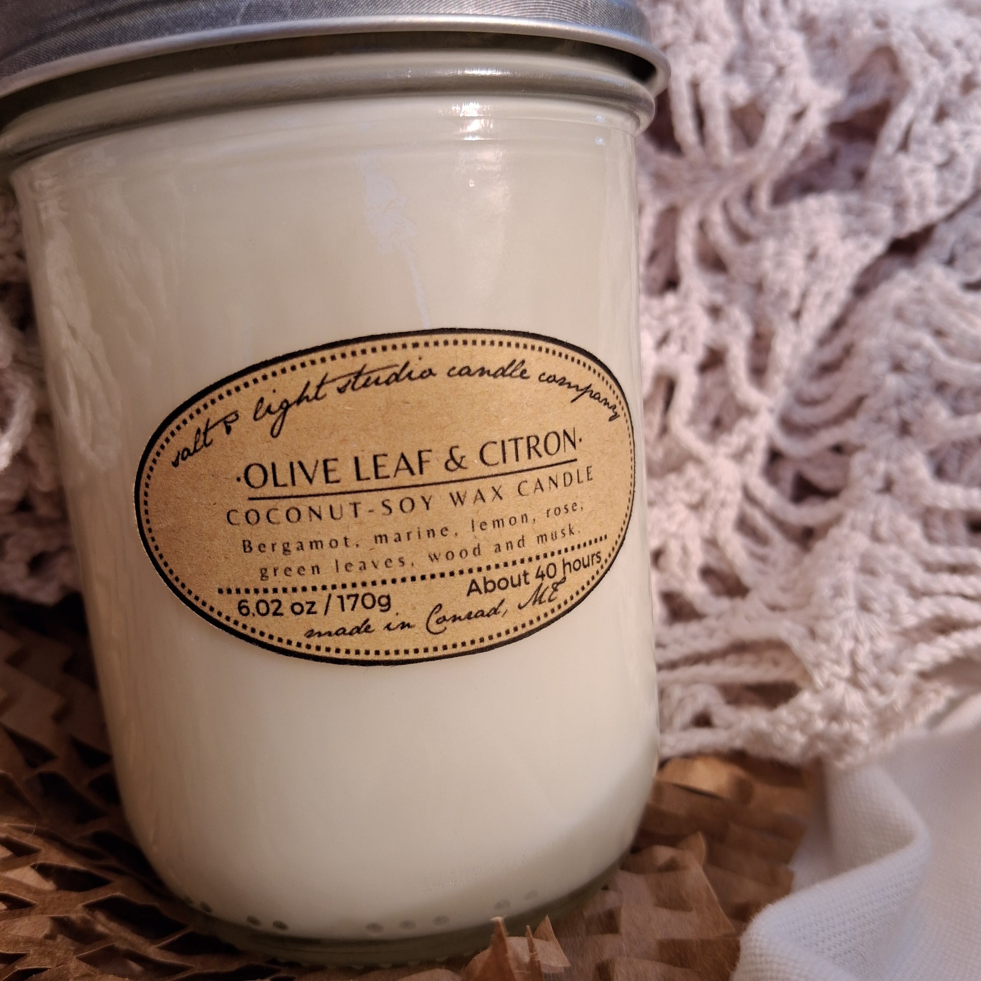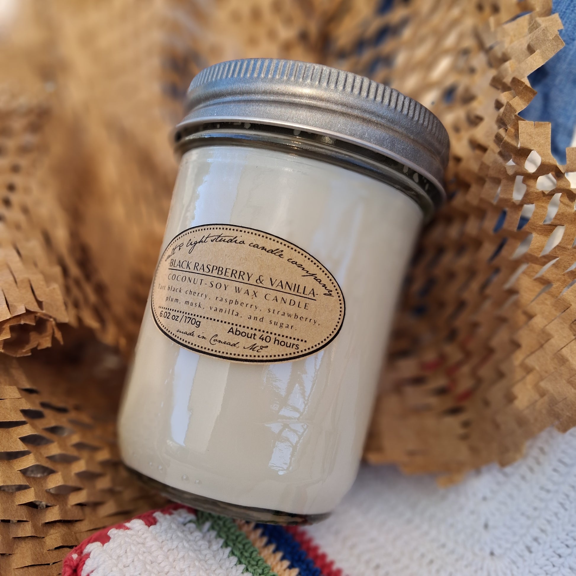 Scented coconut soy wax with braided cotton wick. Half-pint glass jar with lid.