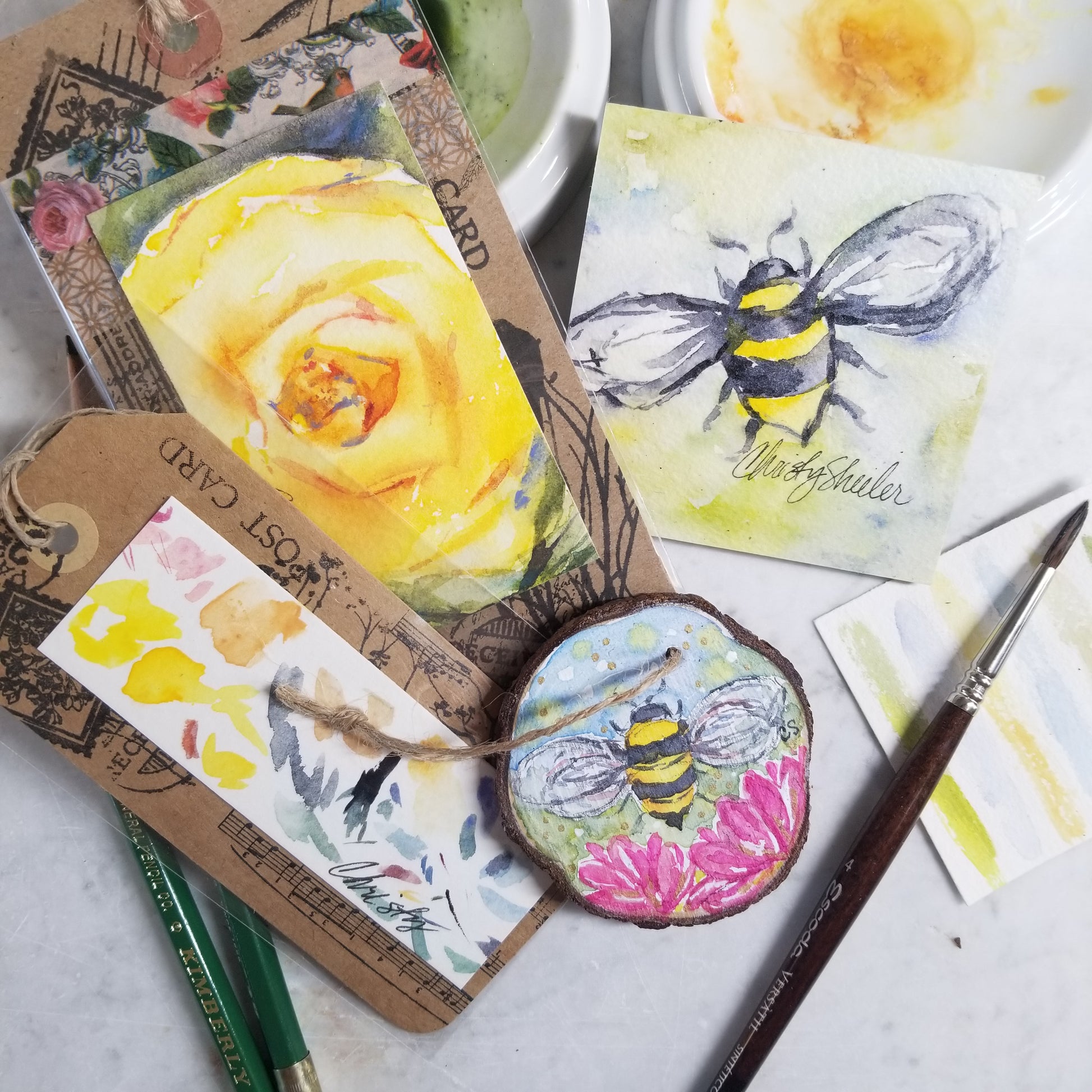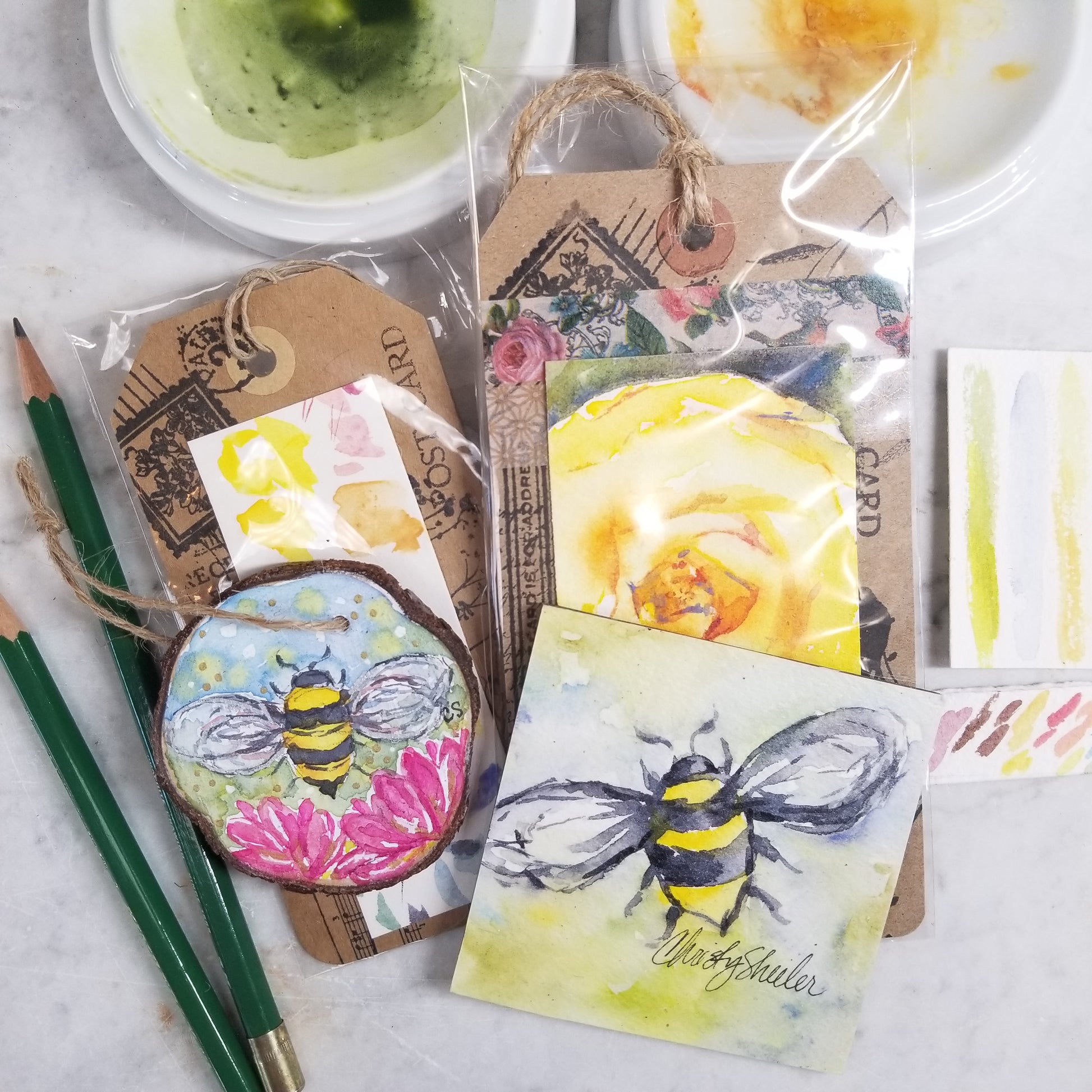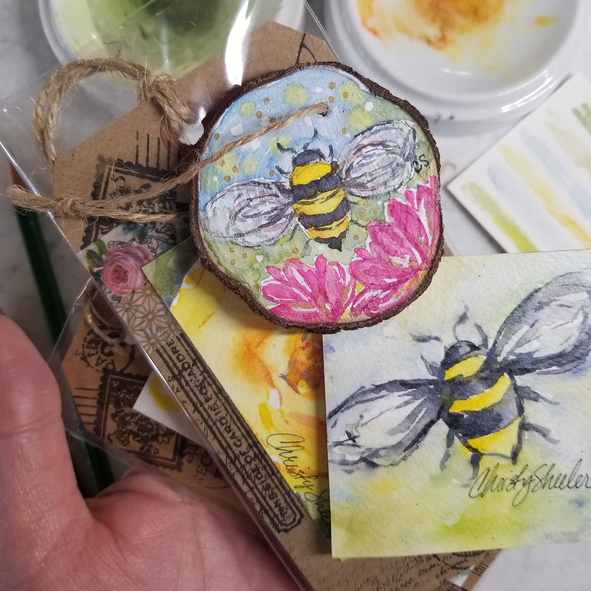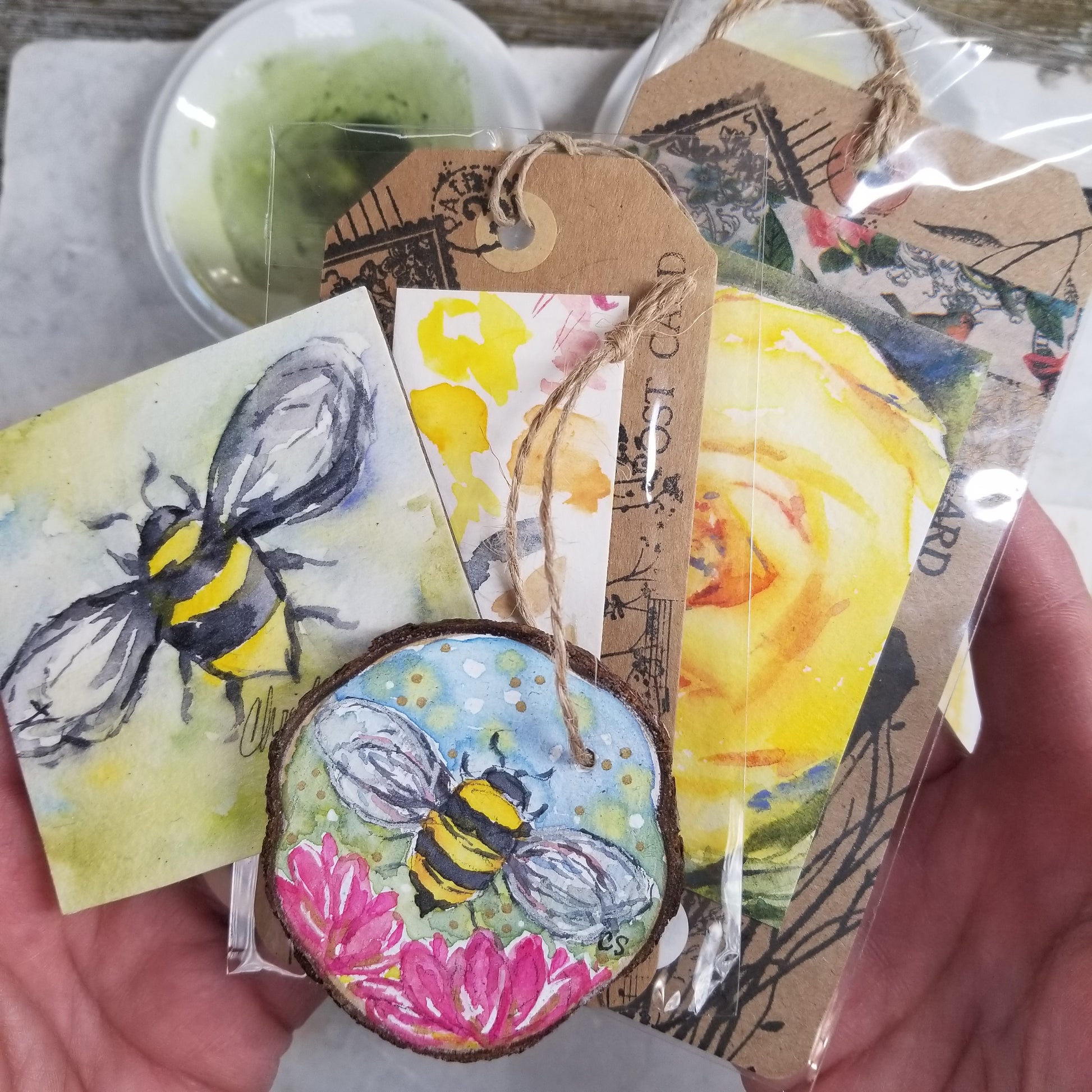 Here's a bundle of bees and florals with yellow being a key theme as well. This four piece set features all hand painted items beginning with a sweet wood ornament. This wood ornament has a bee hovering over pink flowers with accents of silver and gold shimmer. Ornament is about 2 1/2" across and signed both on front and back. There's a 3" magnet with hand painted watercolor bee on a bright green and soft blue background. This bee has been painted on watercolor paper which was trimmed and mounted on magnet backing. Both ornament and magnet are sealed with cold wax as a protective layer. Two bookmarks in two sizes are included. These feature an inspirational scripture stamped on back. One bookmark is accented with a yellow rose and the other with a sampling of color swatches from my paint sessions.