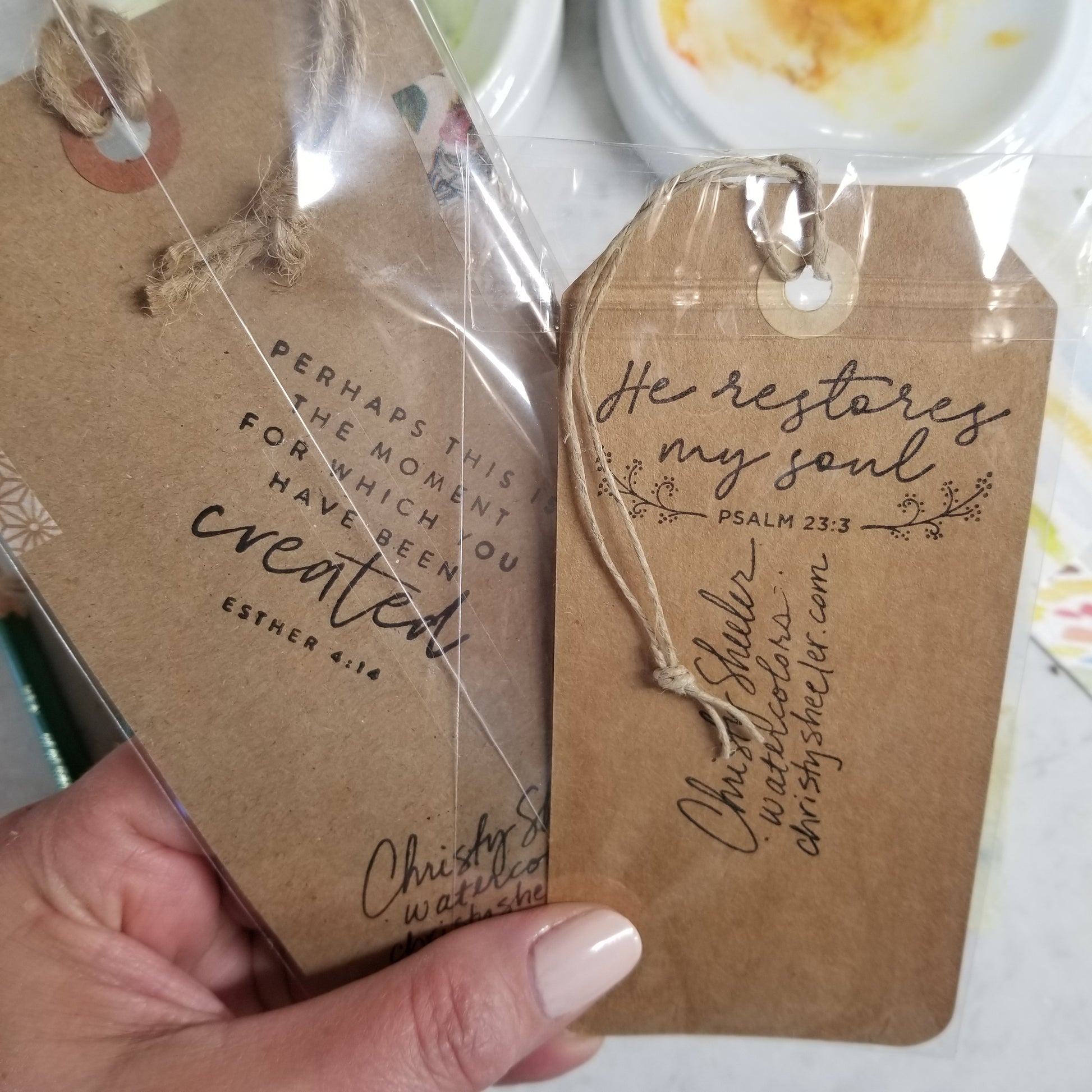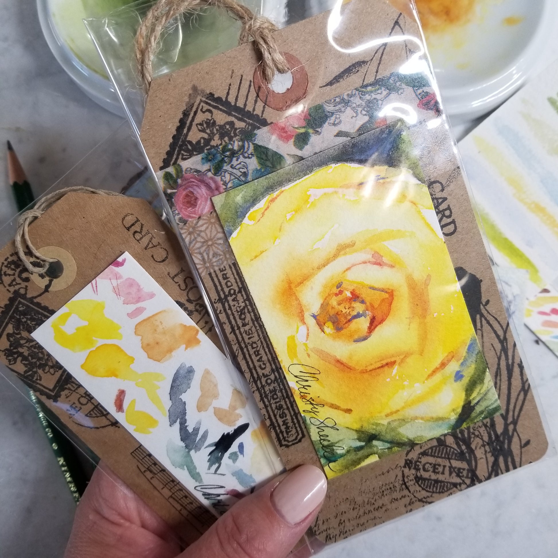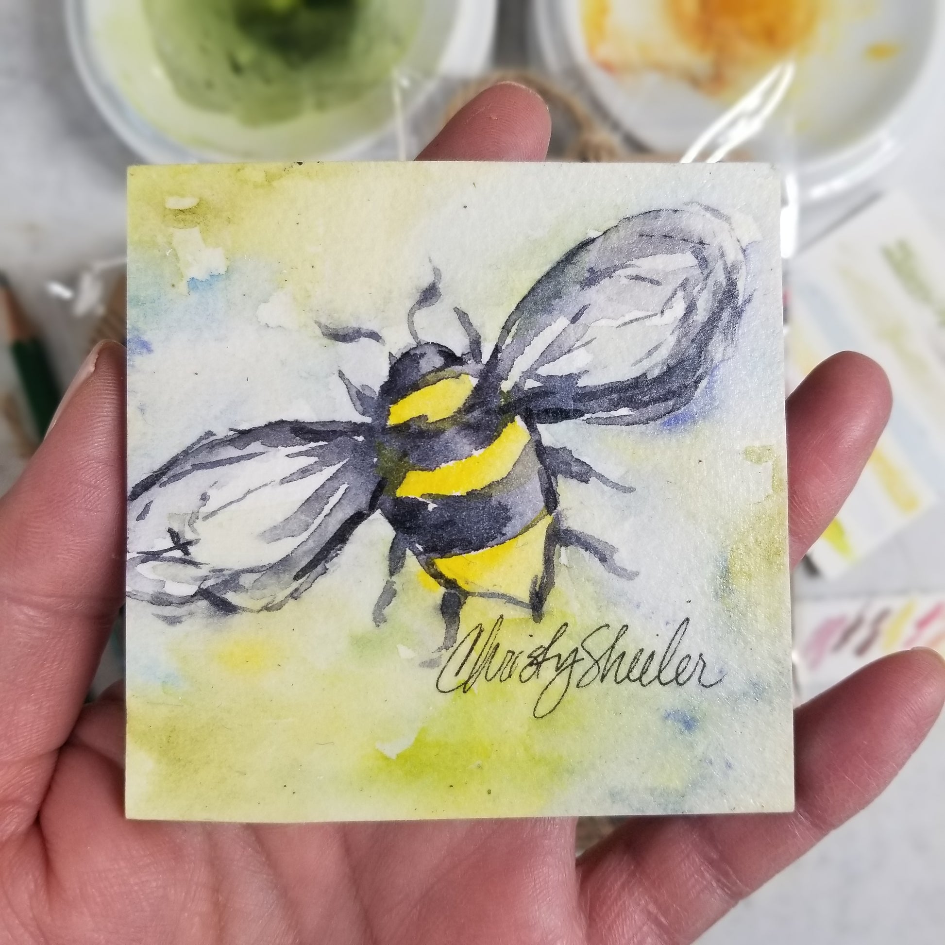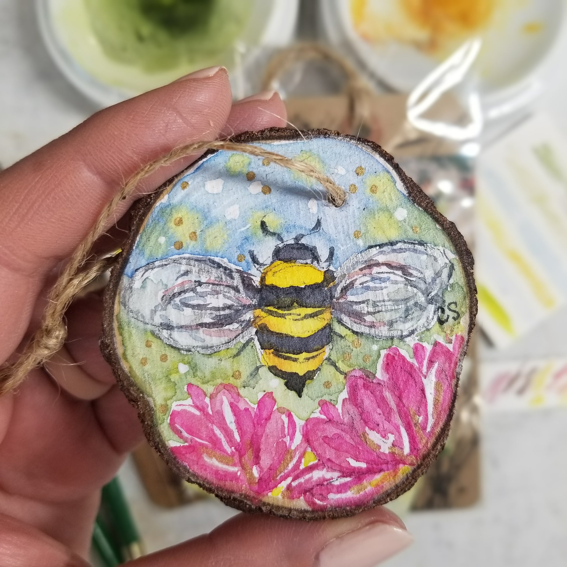 Here's a bundle of bees and florals with yellow being a key theme as well. This four piece set features all hand painted items beginning with a sweet wood ornament. This wood ornament has a bee hovering over pink flowers with accents of silver and gold shimmer. Ornament is about 2 1/2" across and signed both on front and back. There's a 3" magnet with hand painted watercolor bee on a bright green and soft blue background. This bee has been painted on watercolor paper which was trimmed and mounted on magnet backing. Both ornament and magnet are sealed with cold wax as a protective layer. Two bookmarks in two sizes are included. These feature an inspirational scripture stamped on back. One bookmark is accented with a yellow rose and the other with a sampling of color swatches from my paint sessions.
