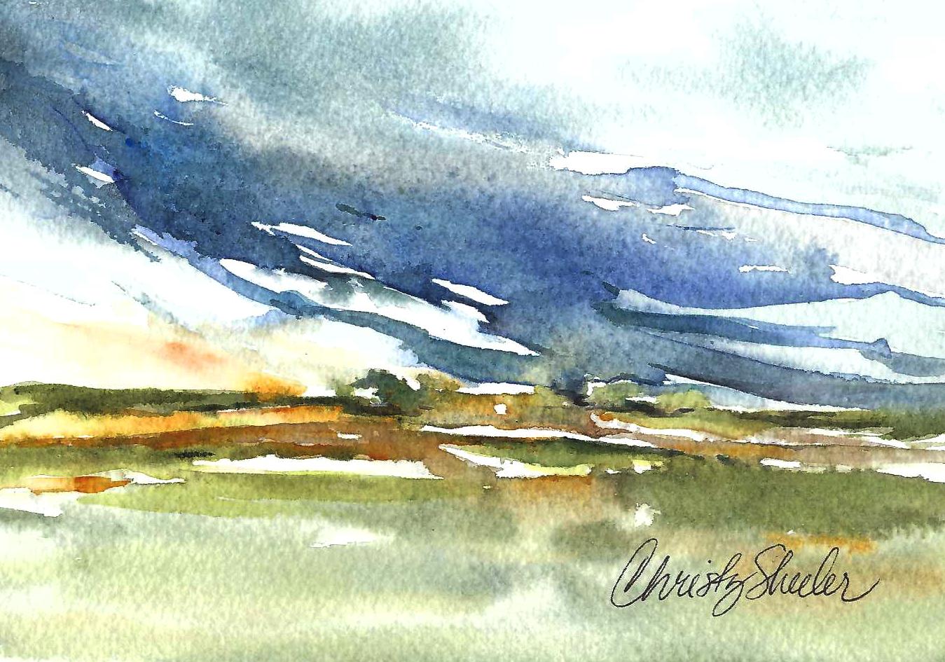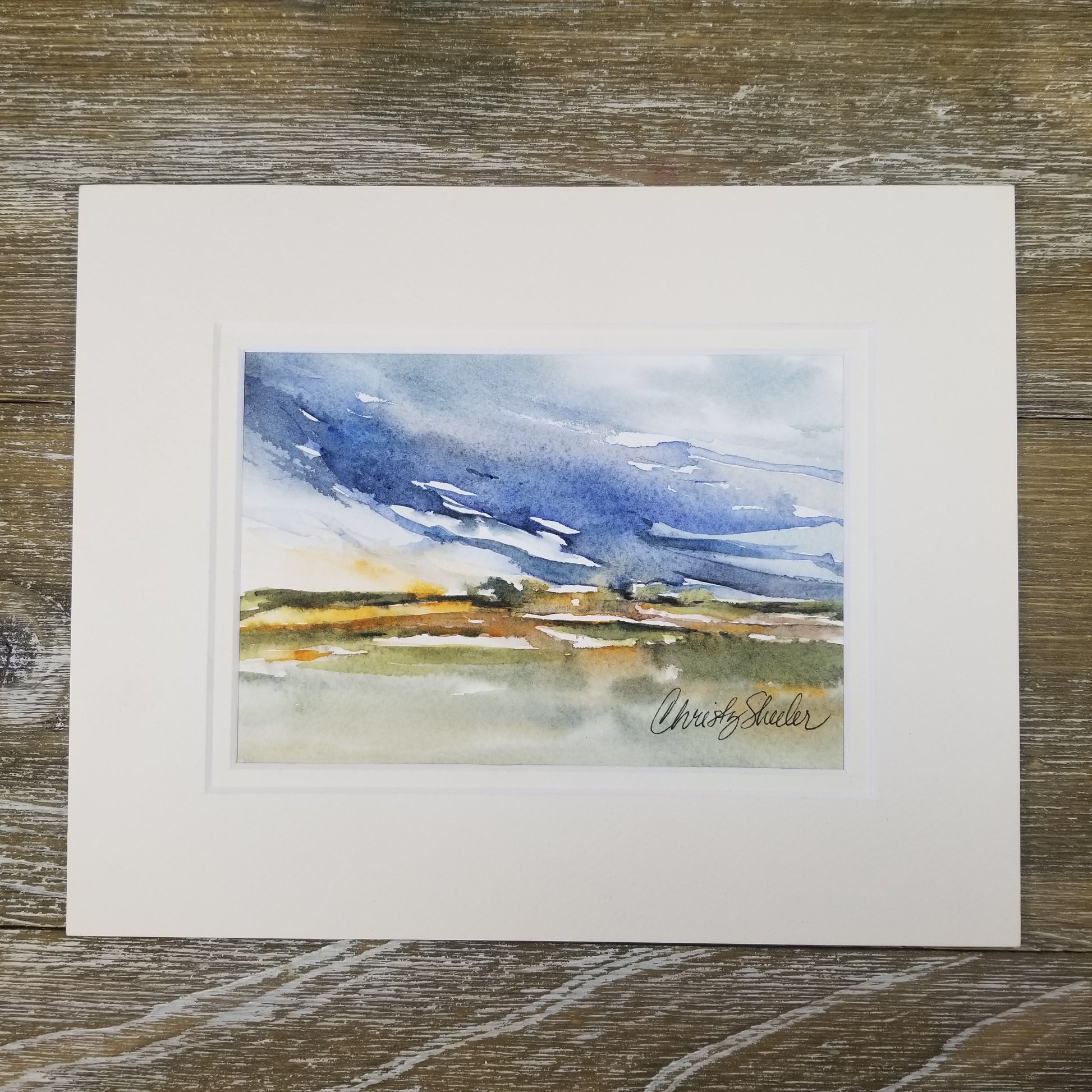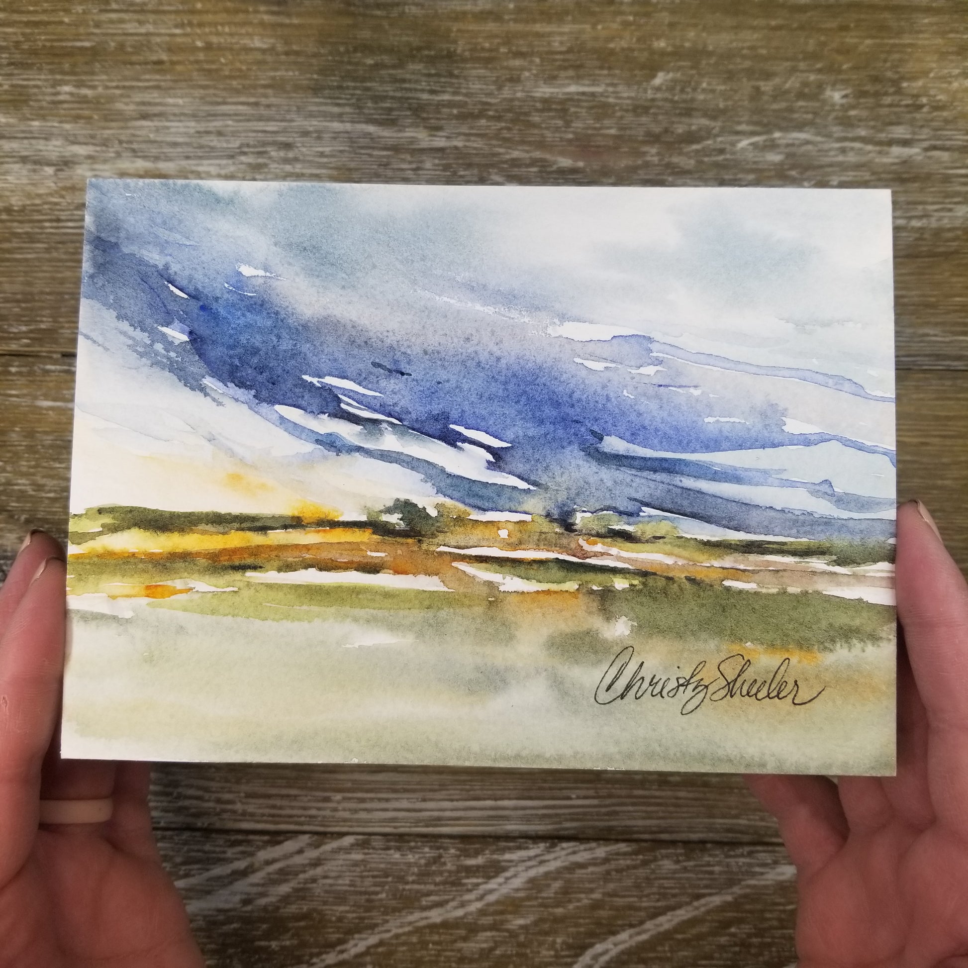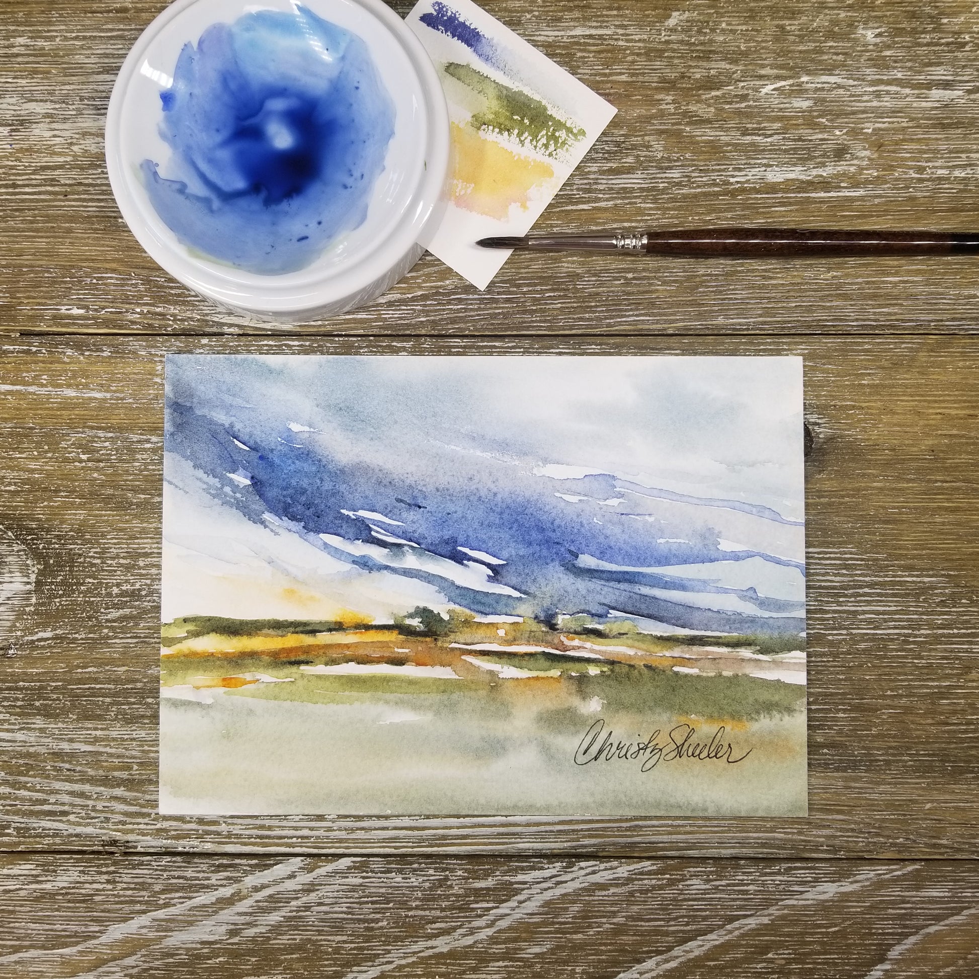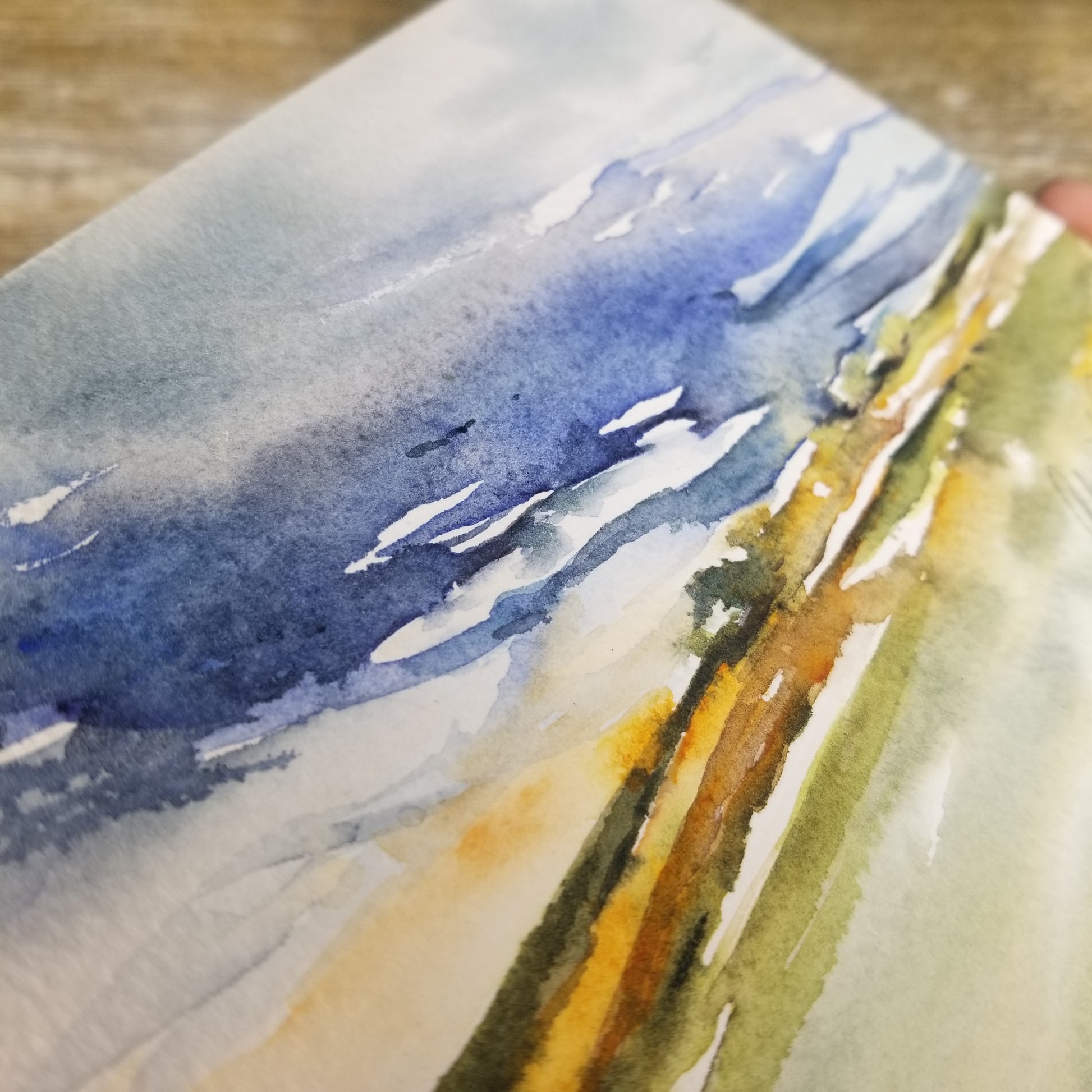 A simpler landscape at first glance. There is so much movement in the sky with the varying blues and the way the watercolor flows into the horizon. While painting this piece, I felt an urge to keep going, adding more detail but I paused to think that over first. The color palette is basic but it doesn't need more. The flow of watercolor pigment with water creates changes in value perfect for this scene. This piece packs a lot for the dimensions!