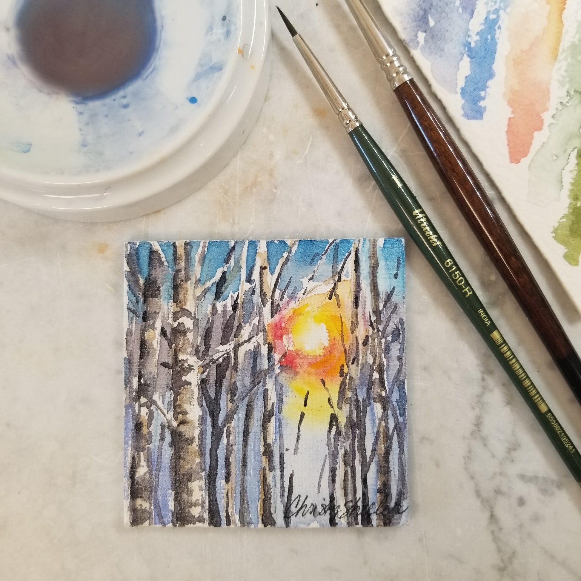 Bringing watercolor painting to a new surface, these 3" magnets are miniature pieces of artwork for kitchen or office. The surface of the magnet has a canvas like texture and once primed with two coats of white watercolor ground, I begin to create with a sketch. The artwork is painted with my smallest brushes to capture the finest details. Once the artwork is done, a protective coating is applied with cold wax. Each one is unique with great care, resulting in a colorful and intricate piece.