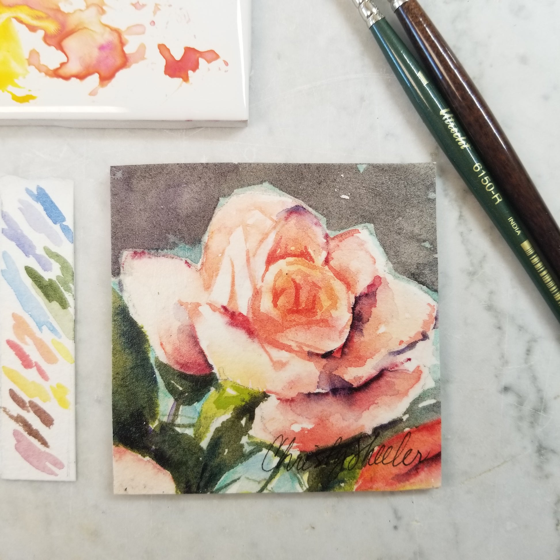 Please note: The pink rose has been painted on watercolor paper, sealed with cold wax, and then mounted on magnet surface. This is the one exception to the description given above.