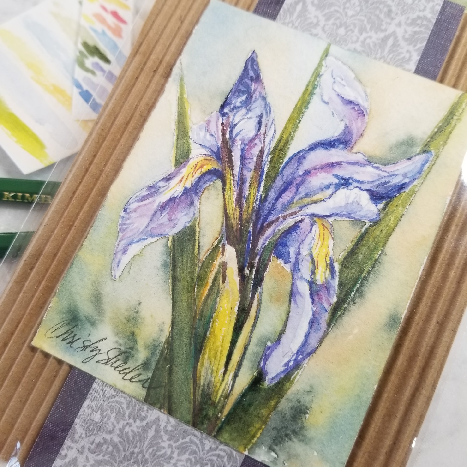 Miniature watercolor of wild iris is mounted on background for easy placement in a 4" x 6" frame. Deep violets and greens with hints of red-violet and yellow define the folds of petals and leaves. Washes of soft color form the background.