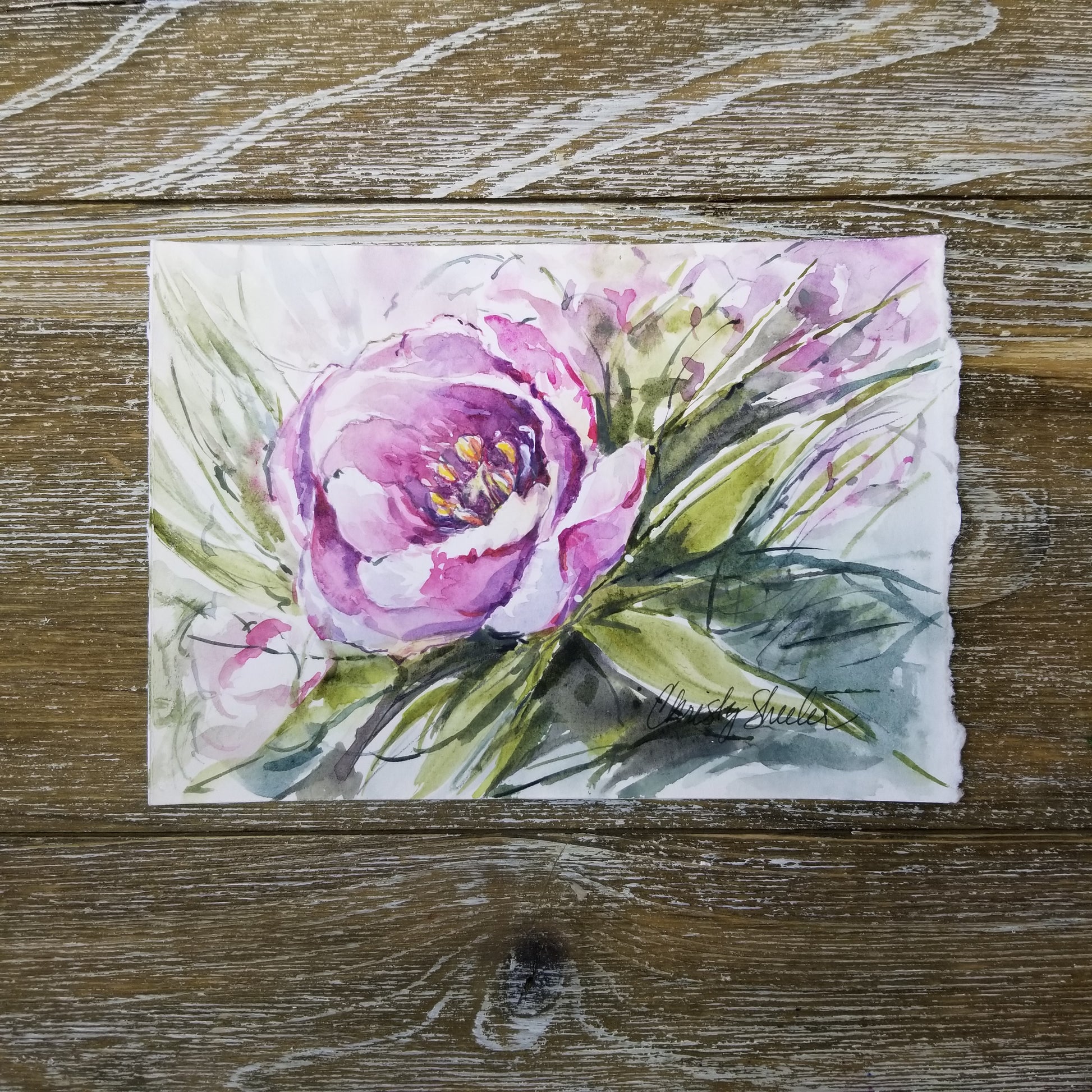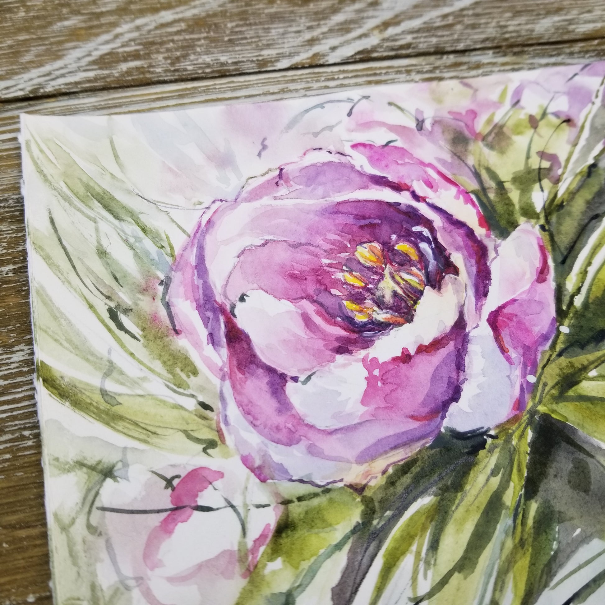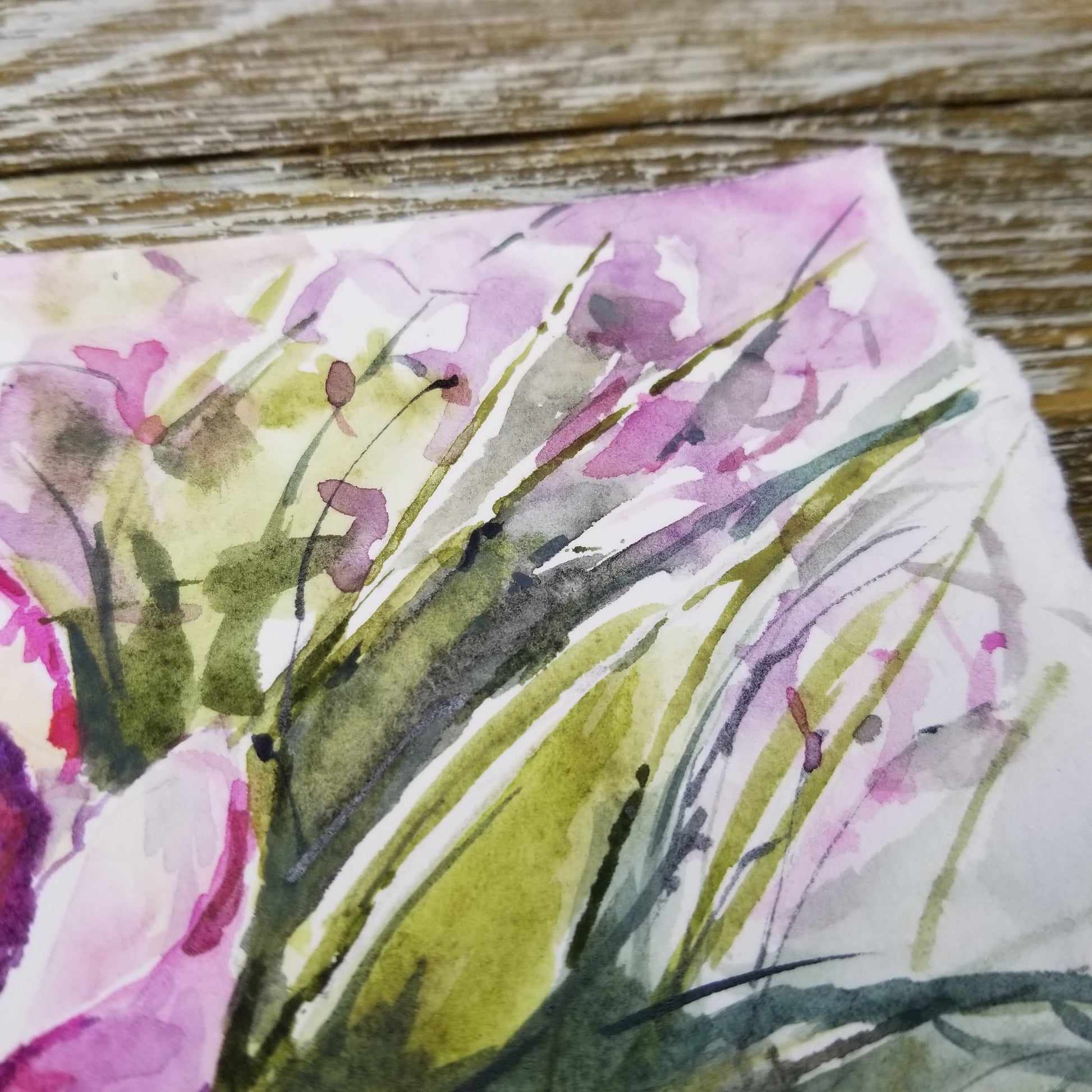 A tulip with ruffled petals in varying purple hues. The paper is a hot press surface, which allows for fine brush lines on the smooth surfaced paper. Loose and fresh in effect, this is a piece with graceful movement.