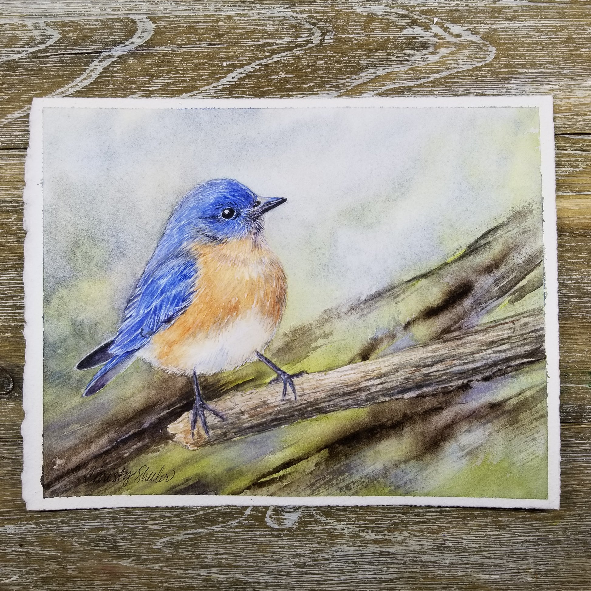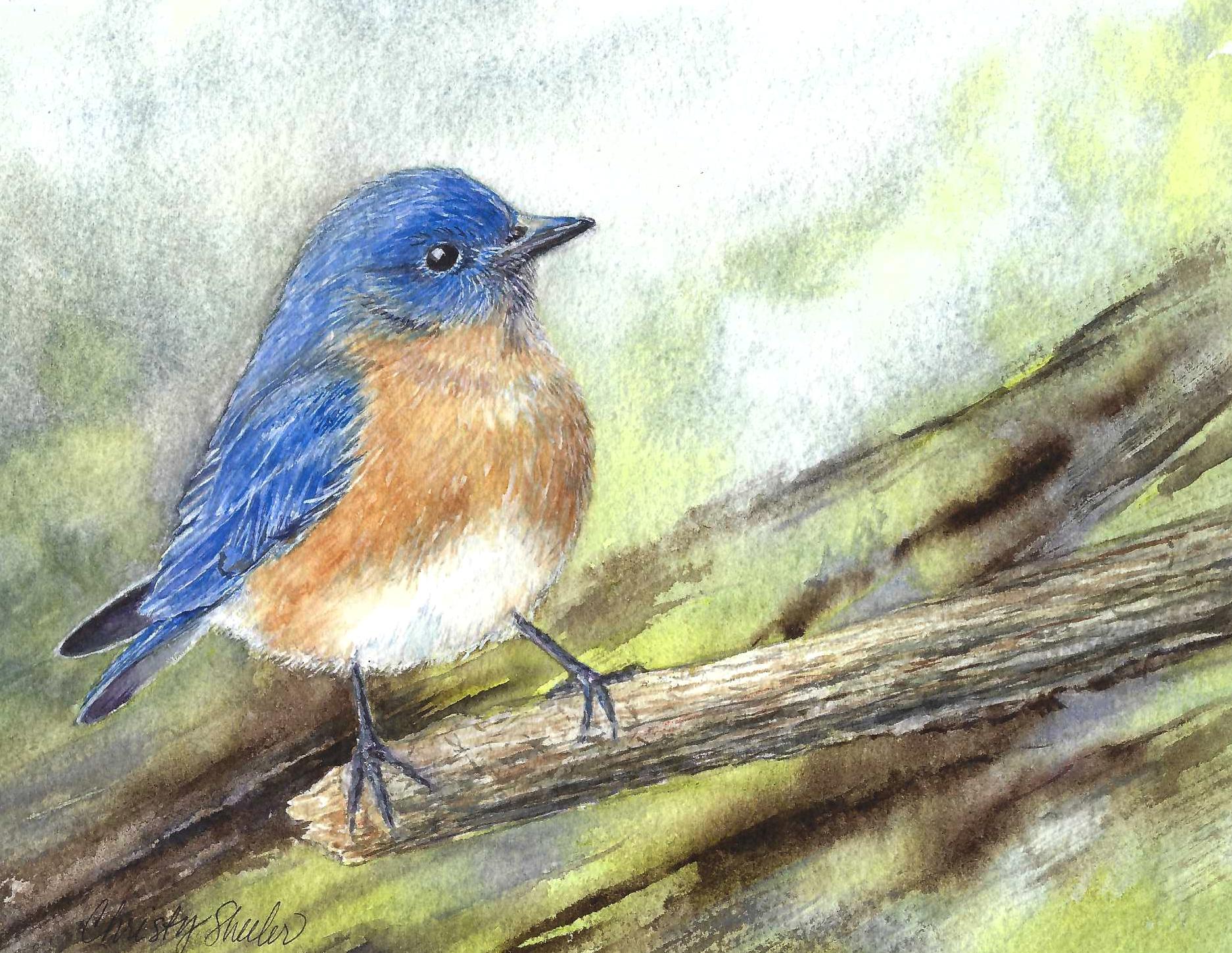 In the midst of a stressful and chaotic day, this bluebird brings inspiration to carry on with a resilient spirit. In the process of painting this piece, the background was a bold decision. Even while a quiet voice in my head spoke of doubt, I painted blue, lavender, green and brown onto the paper. Strokes of courage and strength. This little bluebird is taking a firm stance and unabashedly resilient.