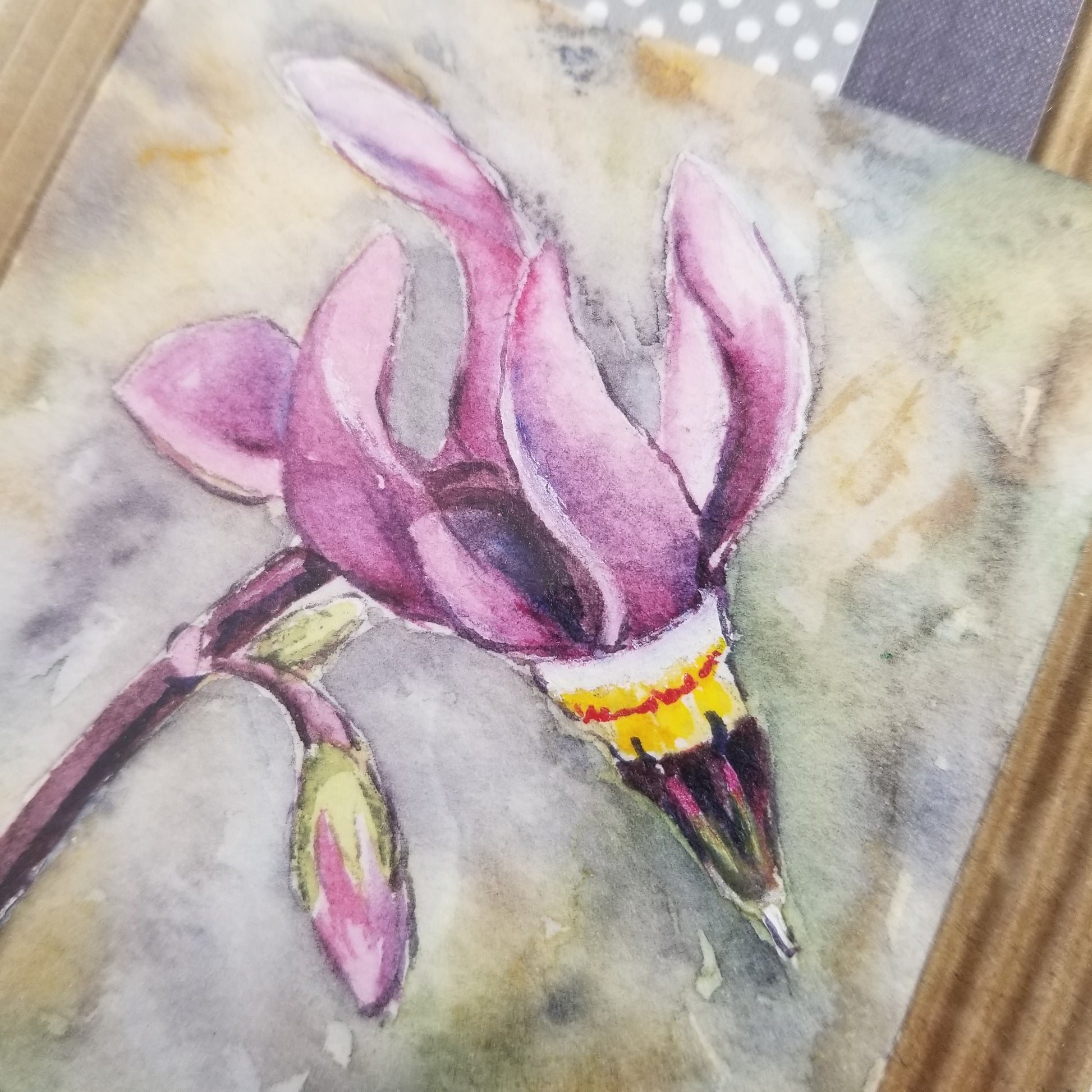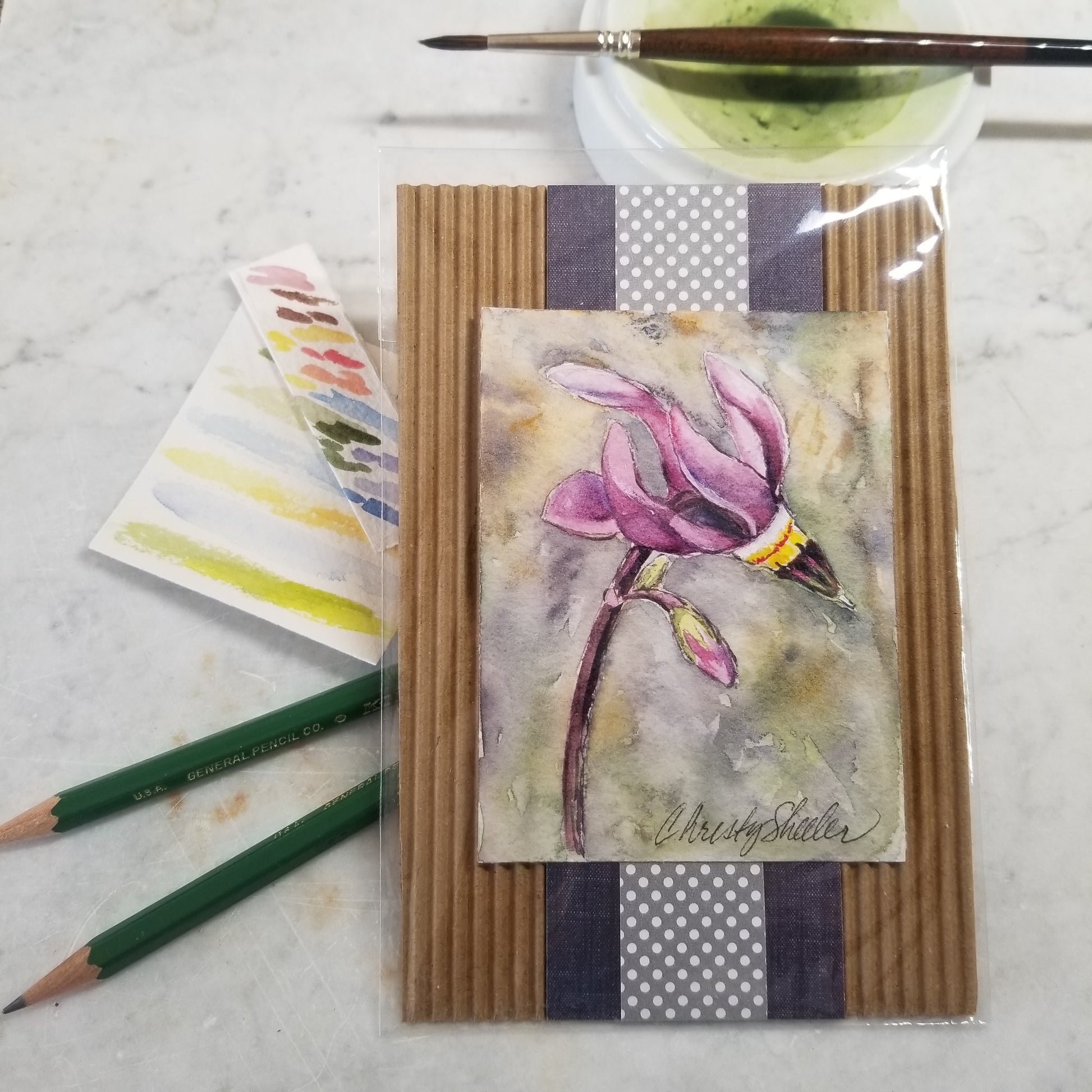 Miniature watercolor of shooting star wildflower in magenta and deep red-violet hues. The petals gracefully move in their own splayed directions and the pointed nose points to the ground. Fine brush work for extra detail in a small space. Mounted on acid-free backing and ready to fill a 4" x 6" frame of your choosing.