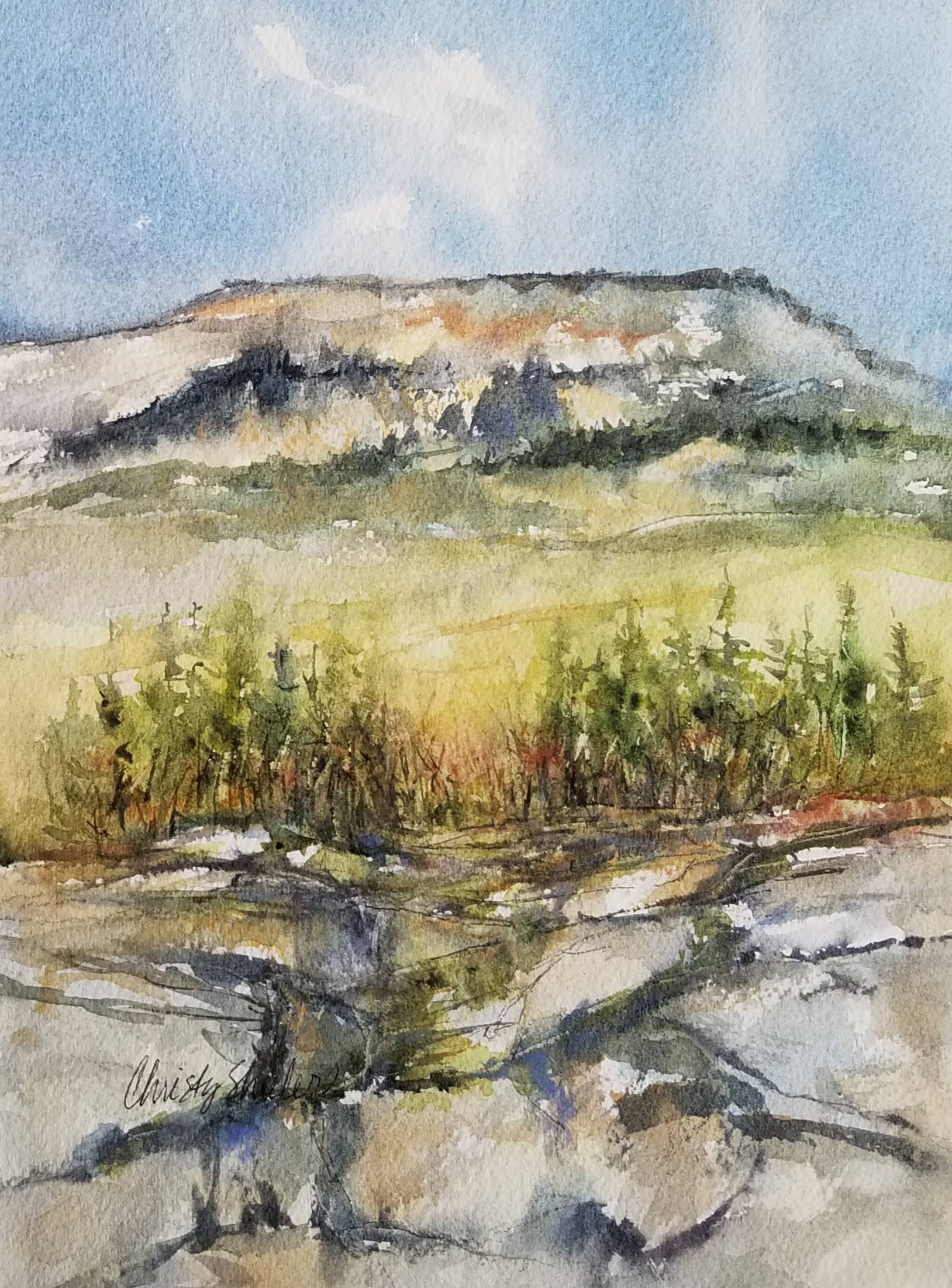 There's a wall of rocks just begging to be climed and explored for a little while. Once the top is reached and the trees give some shade for cooling off, I am sure the view will be spectacular. Enough detail to describe the lanscape. Enough loose and soft areas to let you imagine the rest.