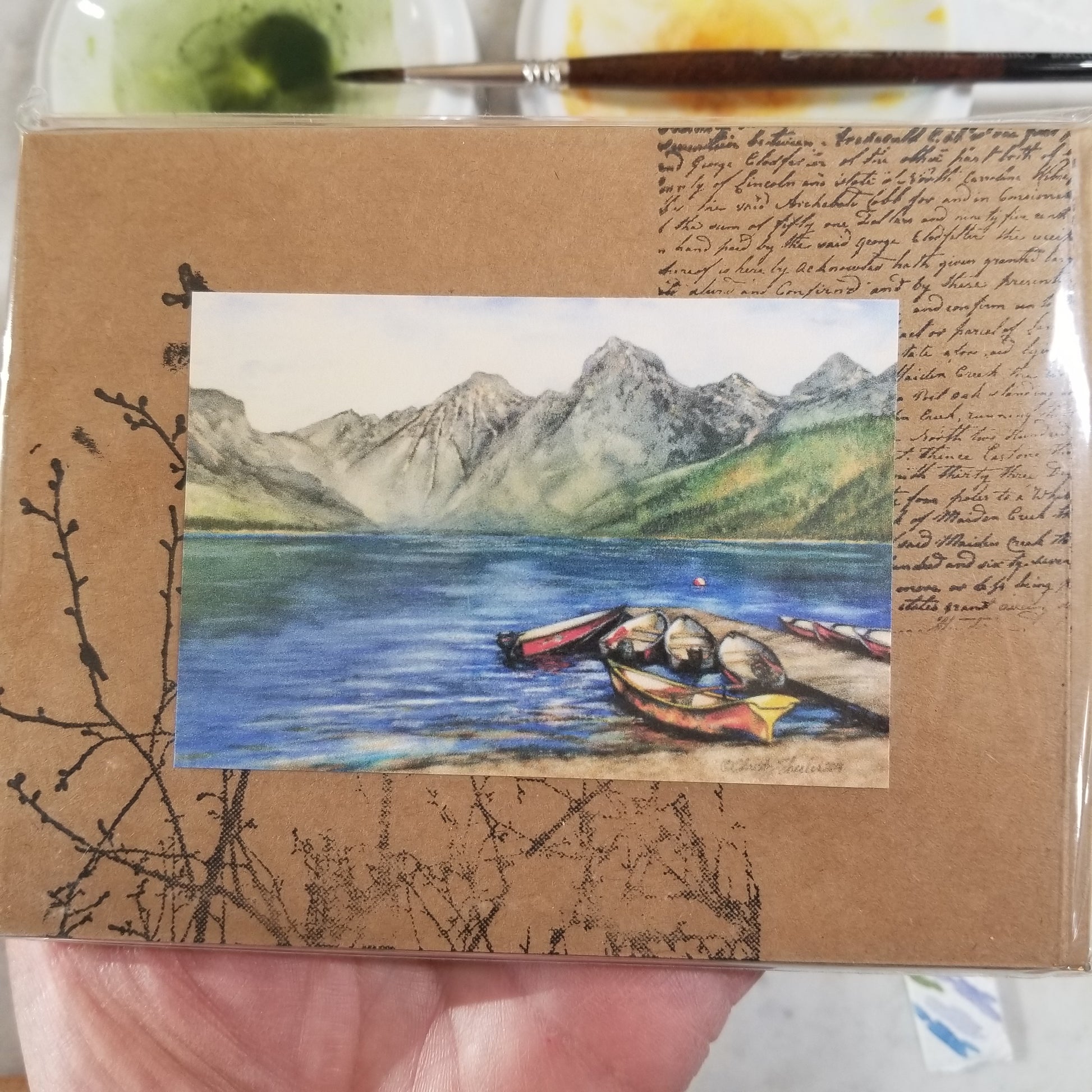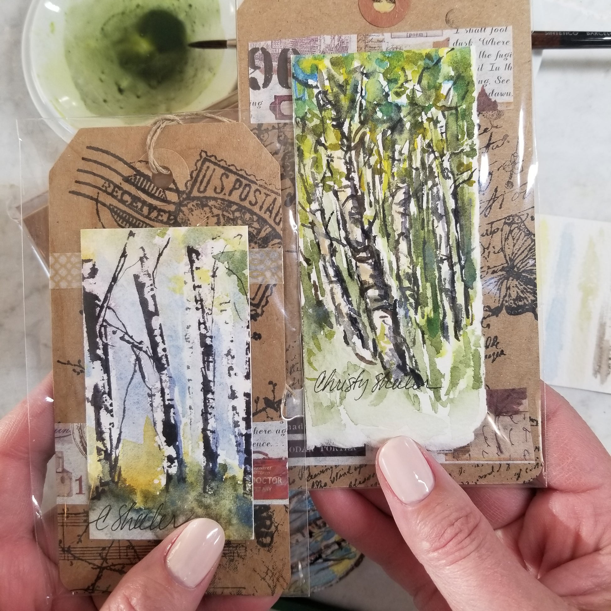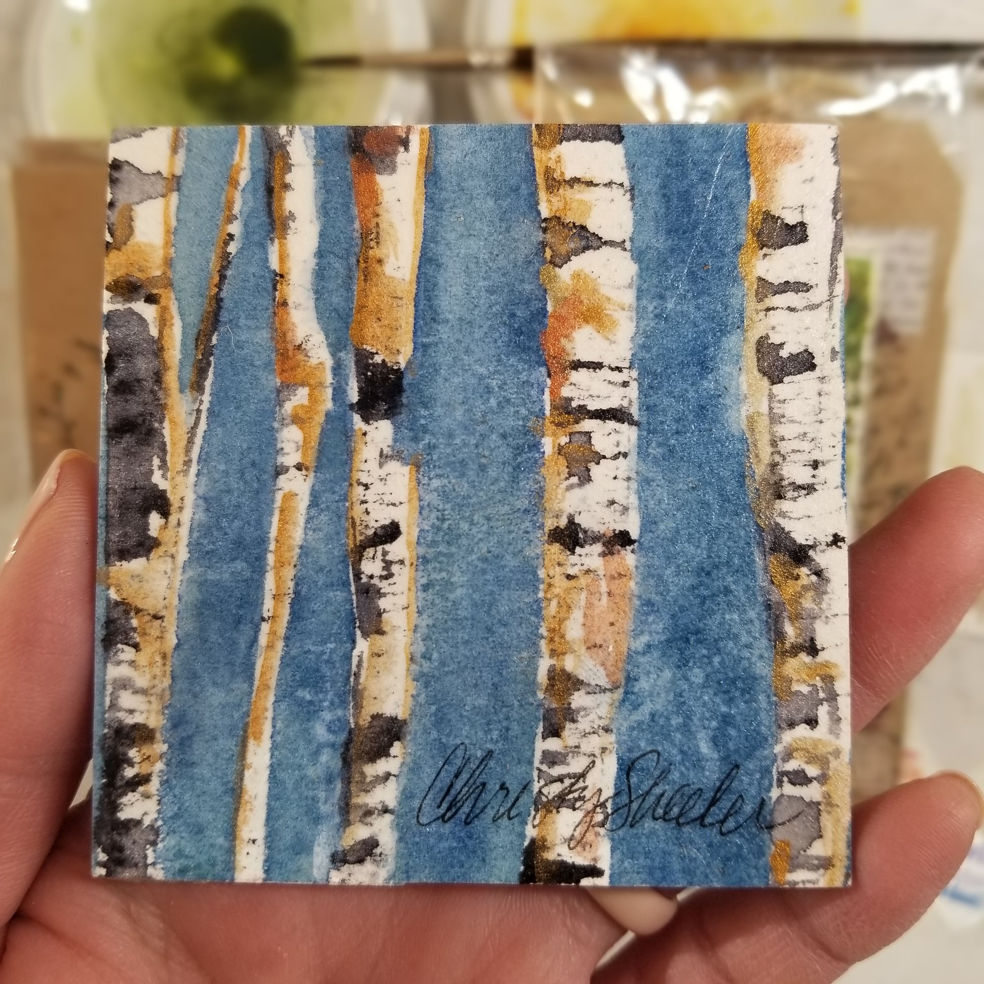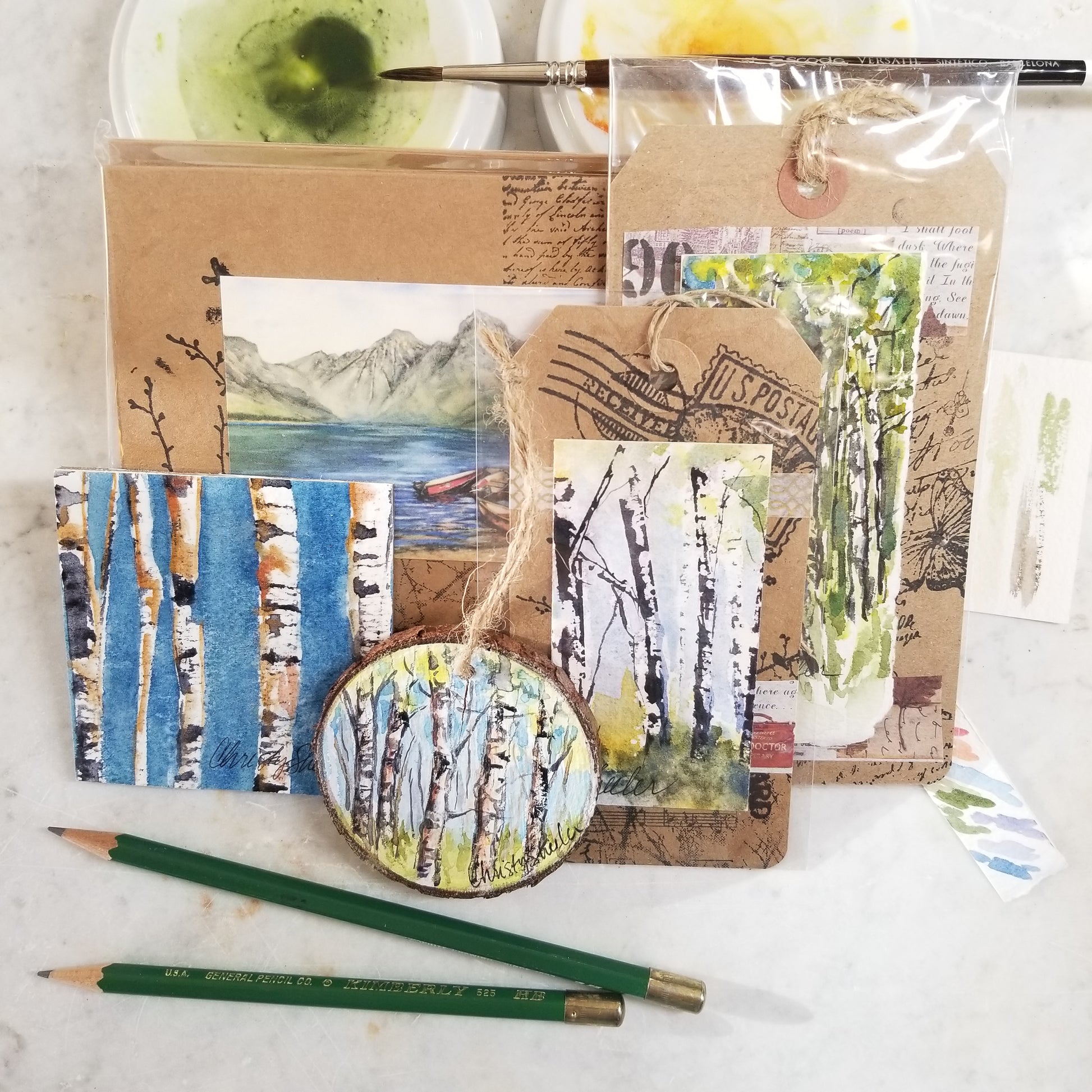 Take a hike through the trees today! A selection of unique pieces inspired by trees and nature. The notecard set of 8 different landscape mini prints has a preview on back of package. A 2 1/2" wood slice ornament features hand painted miniature watercolor of trees on blue sky. A 3" magnet is hand painted with watercolors on watercolor paper. Both ornament and magnet are sealed protectively with cold wax. Bookmarks feature watercolor of trees with aspen or birch like bark; inspirational scripture is stamped on back. This is such a lovely set of tree themed pieces with so much detail.