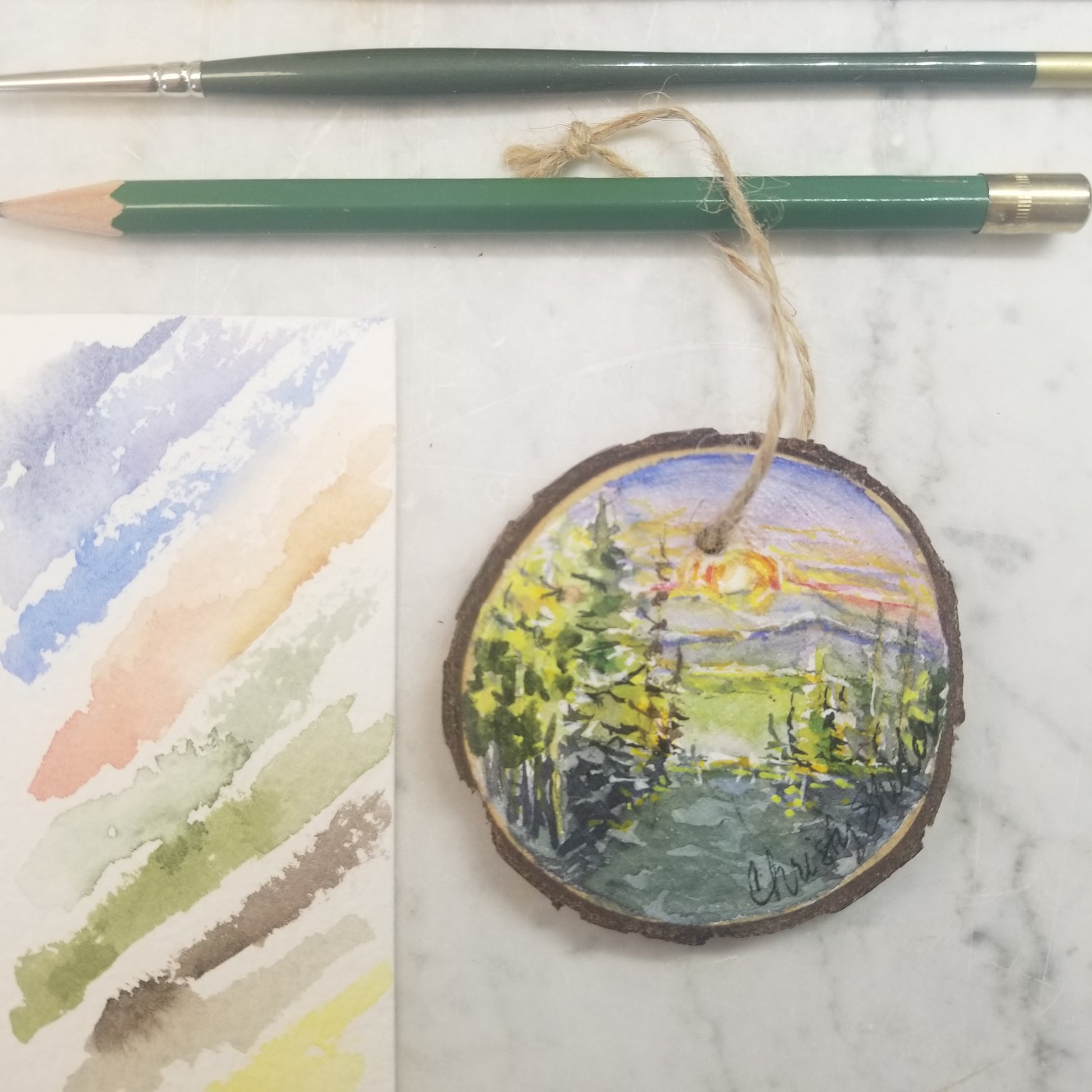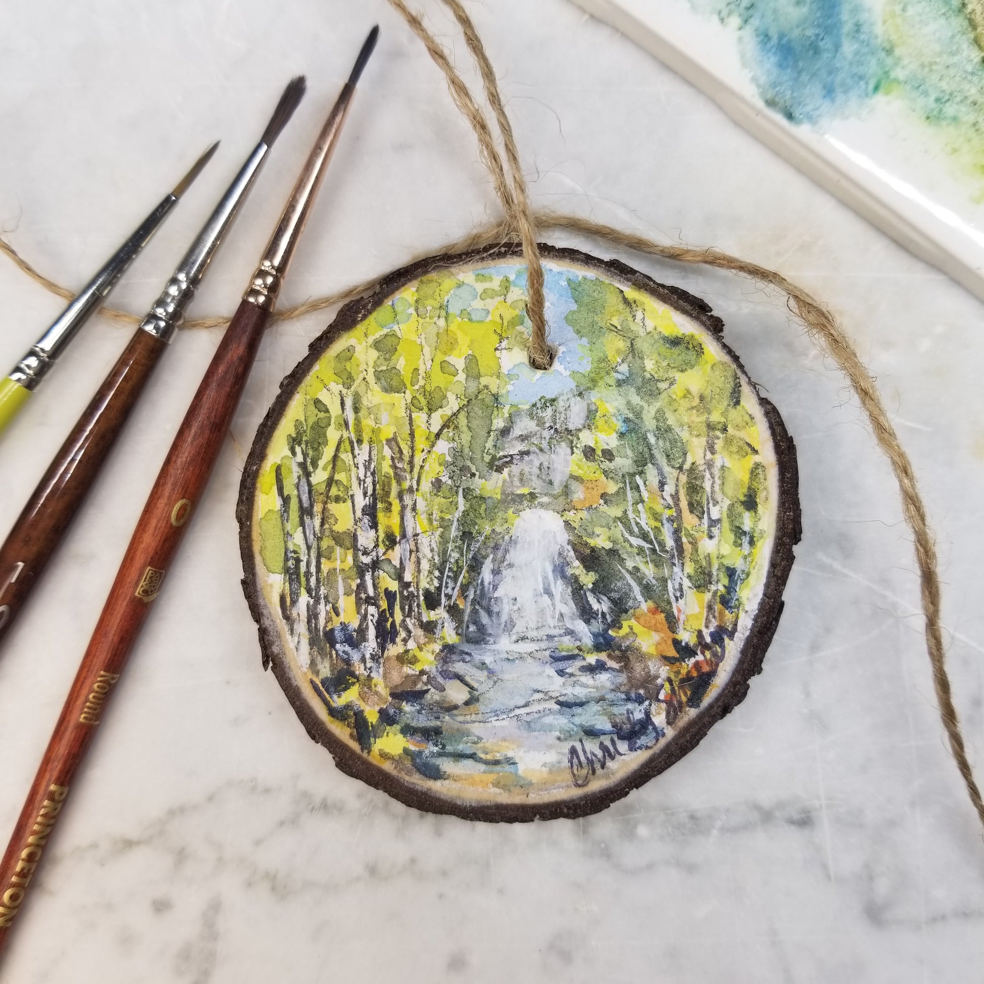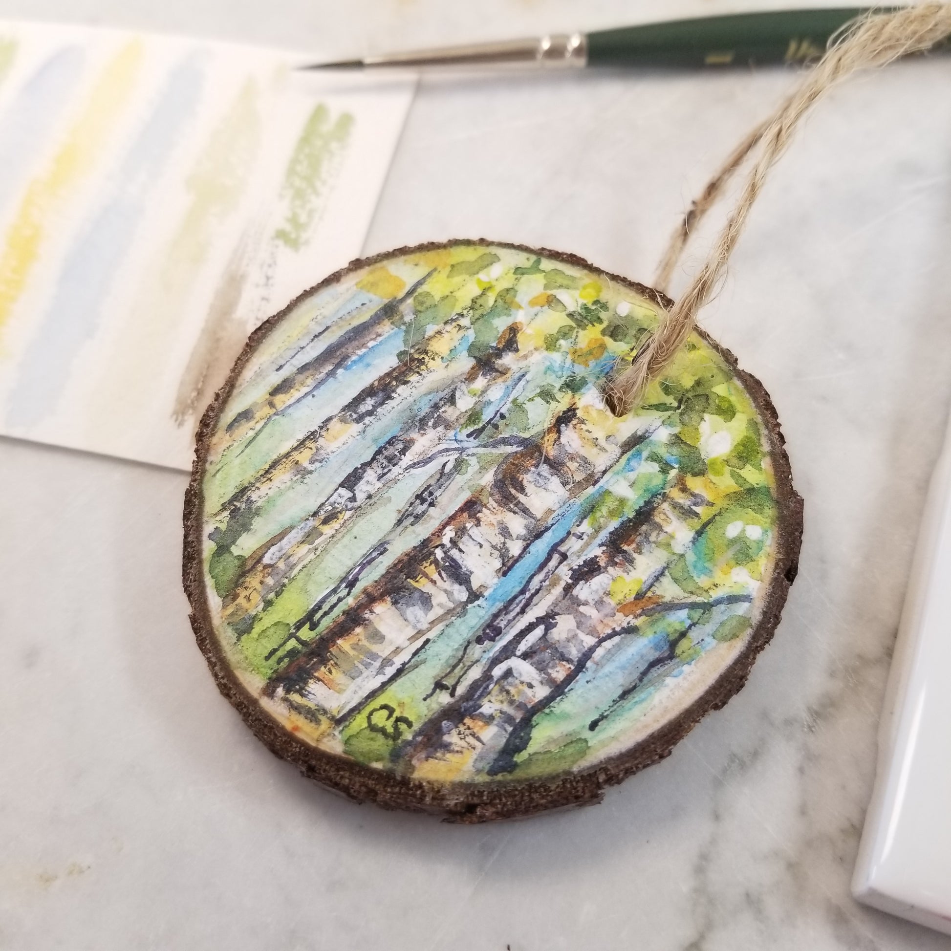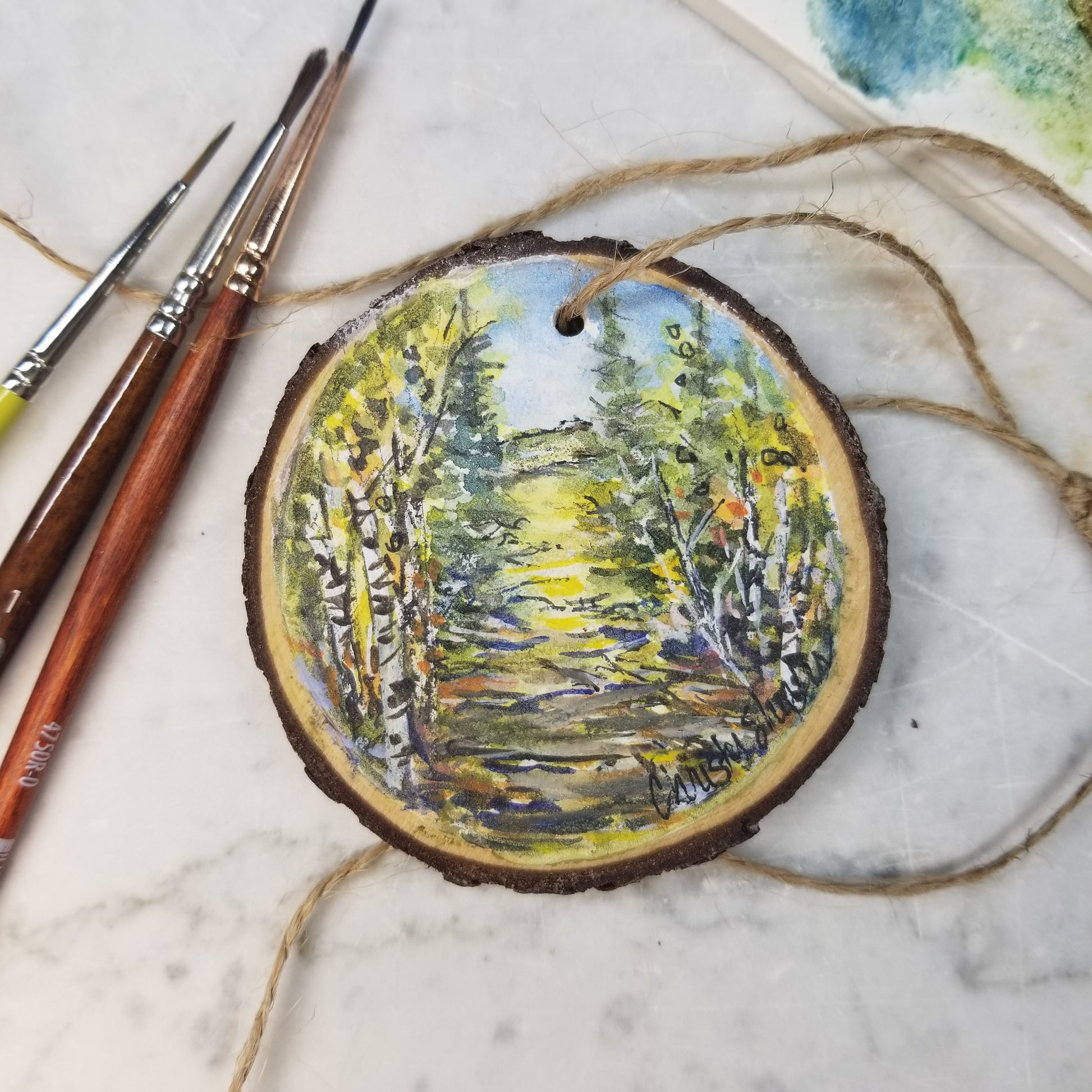 Watercolor painted on wood? Yes! It is a bit more of a lengthy process but the result is amazingly beautiful. The wood ornament is sealed and primed before my brushes can begin adding color. Working in an area under 3" across, my smallest brushes do quite a bit of work. When the art piece is finished, I apply a coat of cold wax to seal and protect the design. Once buffed with a soft cloth, the ornament is completely finished. A piece of jute twine is threaded through the top and it's ready to display on the Christmas tree.