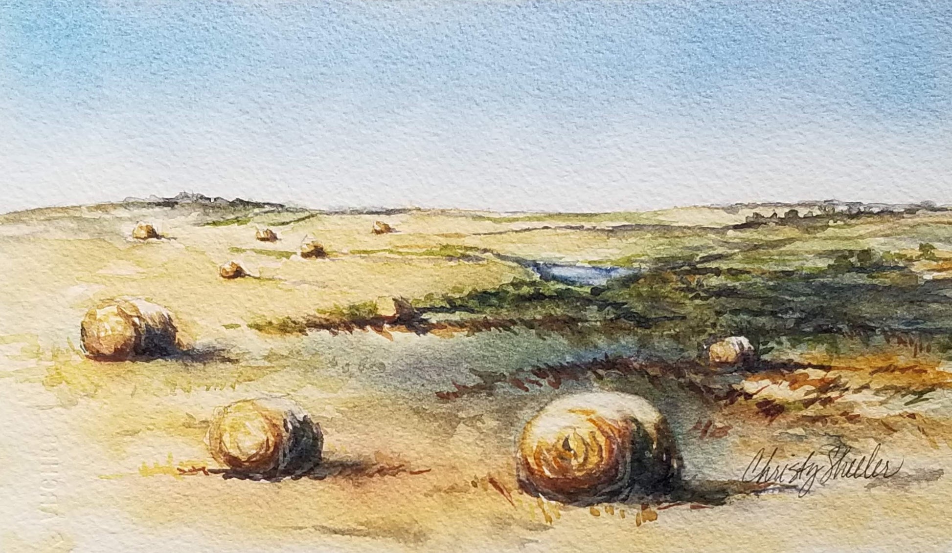 The expanse of golden fields spread out under a big sky full of blue...the bales are scattered here and there, sun casting shadows that hug them. Maybe we see homesteads in the far distance, trees lined up along a road winding to the horizon. This piece is painted to extend a feeling of calm and rest after the hard and long days.