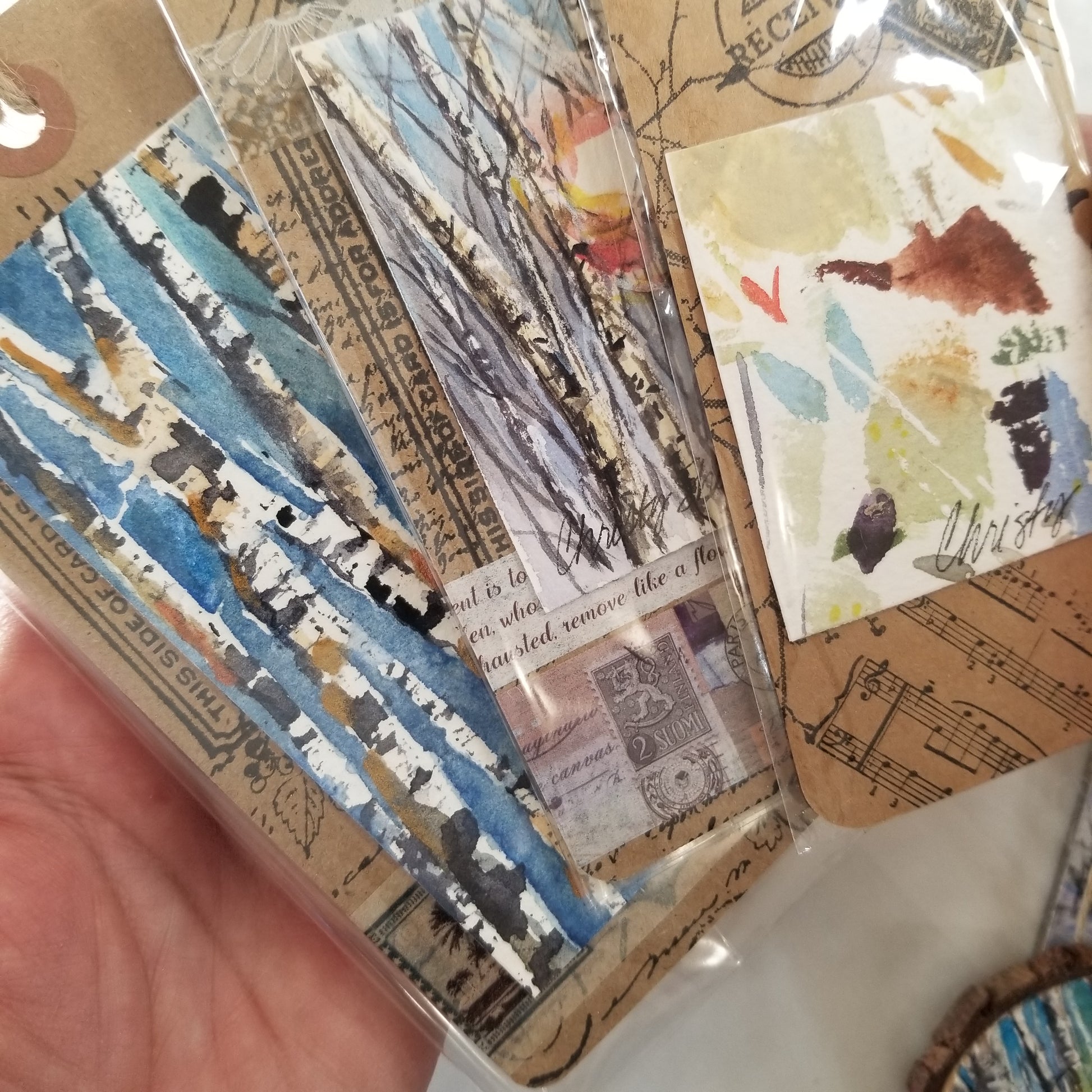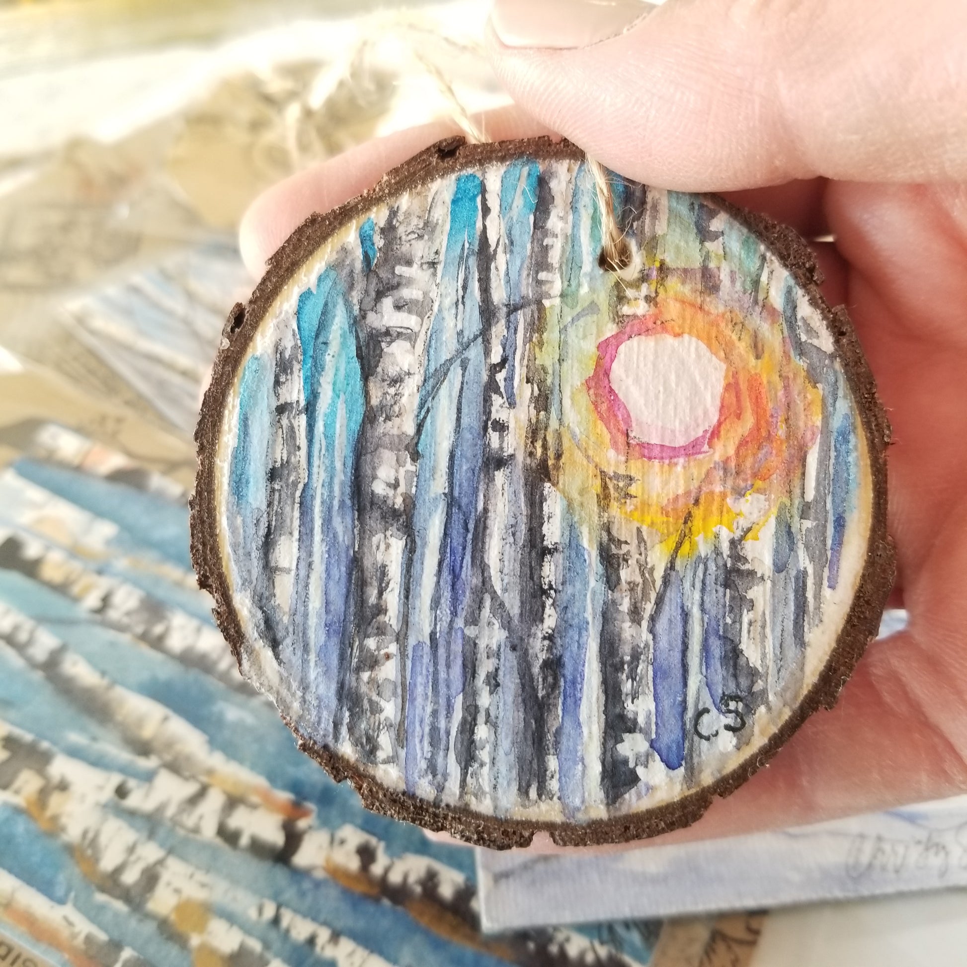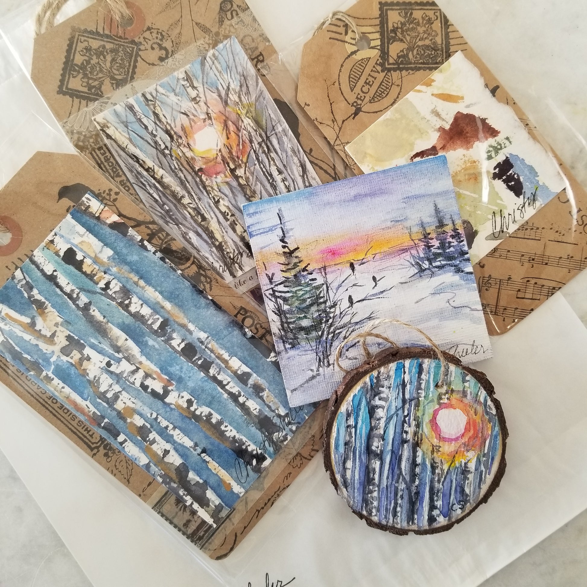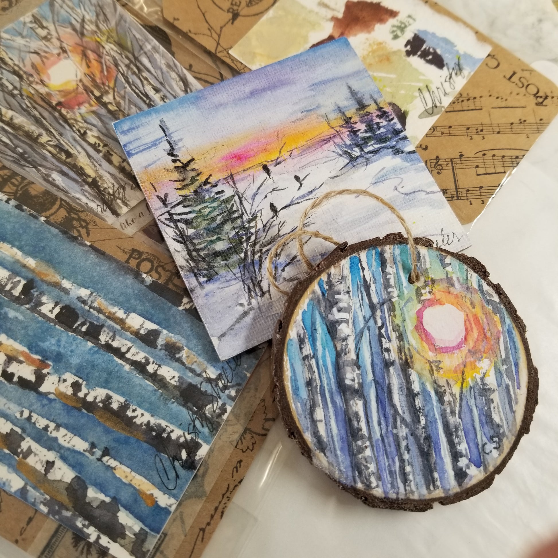 A selection of small watercolor extras each with an accent of watercolor painting. One 2.5" wood ornament painting of sunshine through trees with watercolors. One 3" magnet featuring a sunset landscape painted with watercolors. One medium bookmark with sampled swatches of watercolor as a mini abstract. Two large bookmarks with birch or aspen types of trees in winter. Bookmarks are stamped with an inspirational scripture on back. The ornament and magnet are sealed with cold wax to protect the artwork.