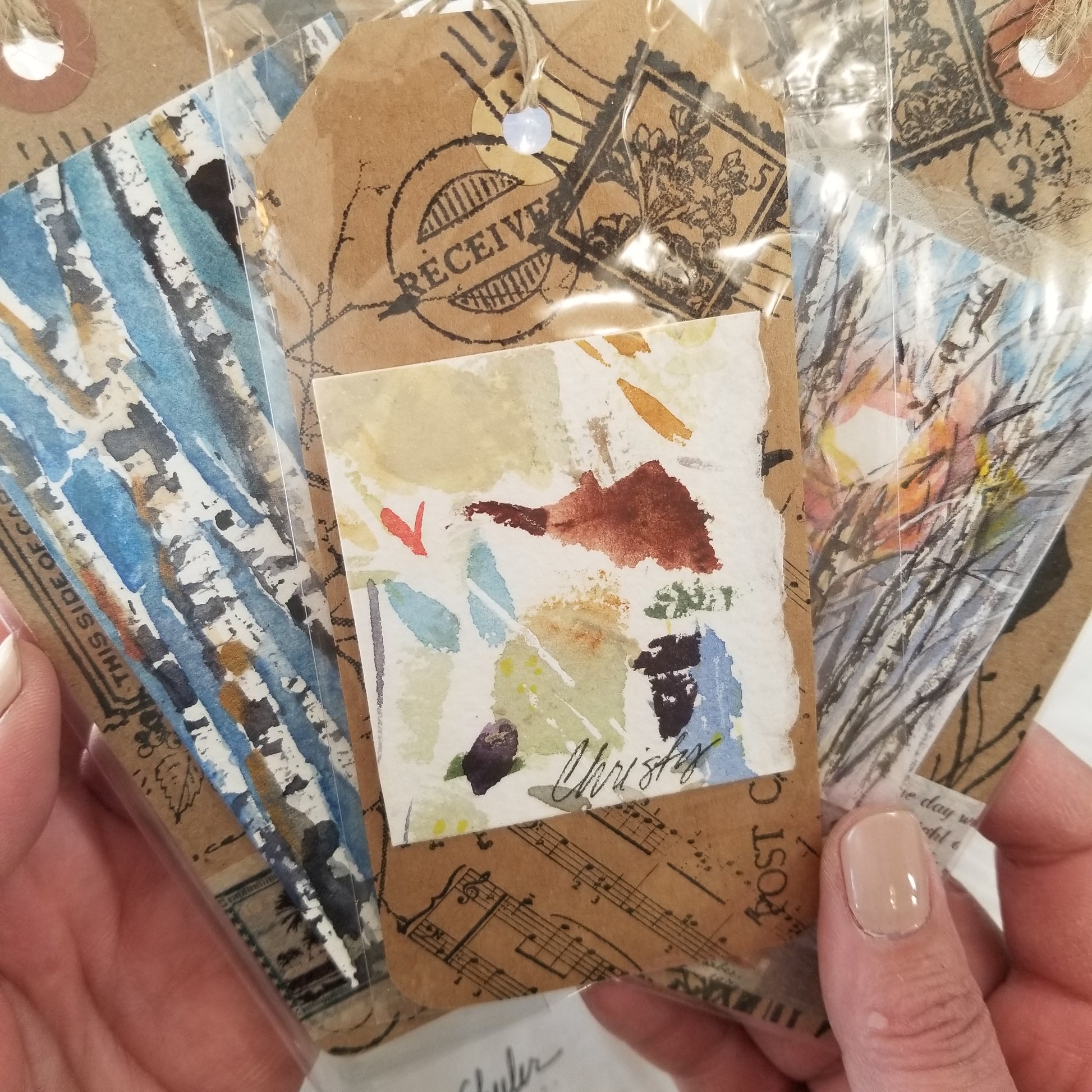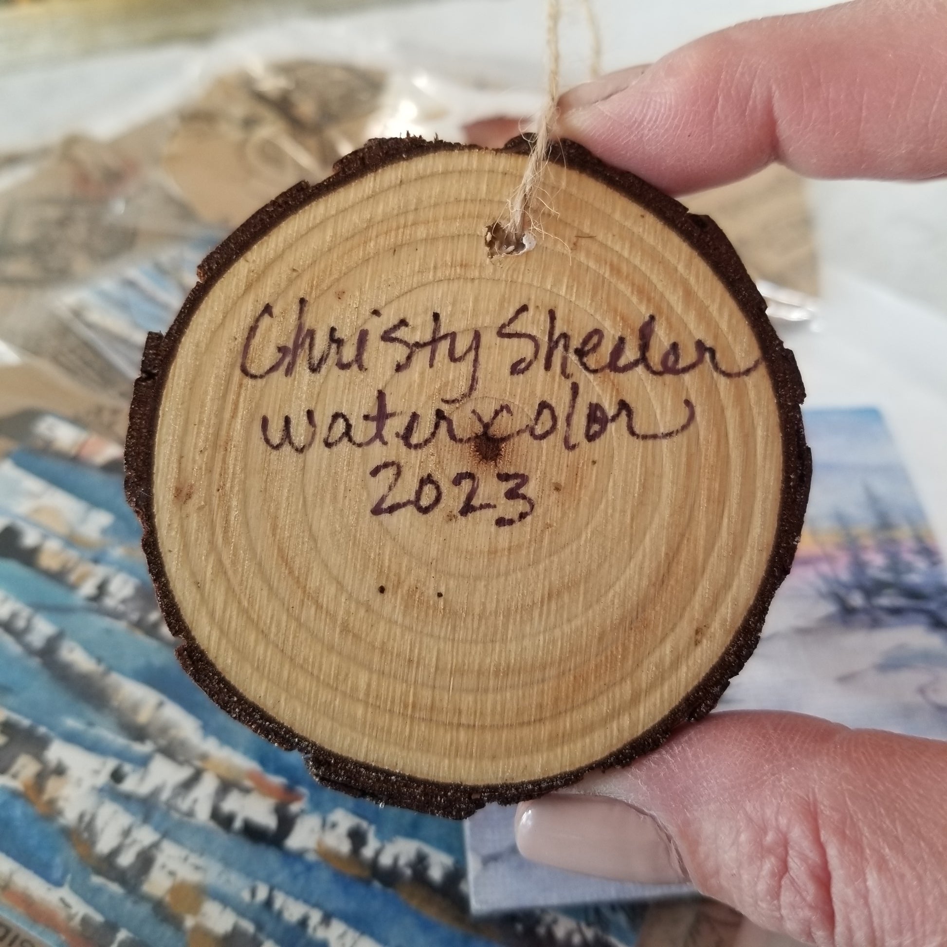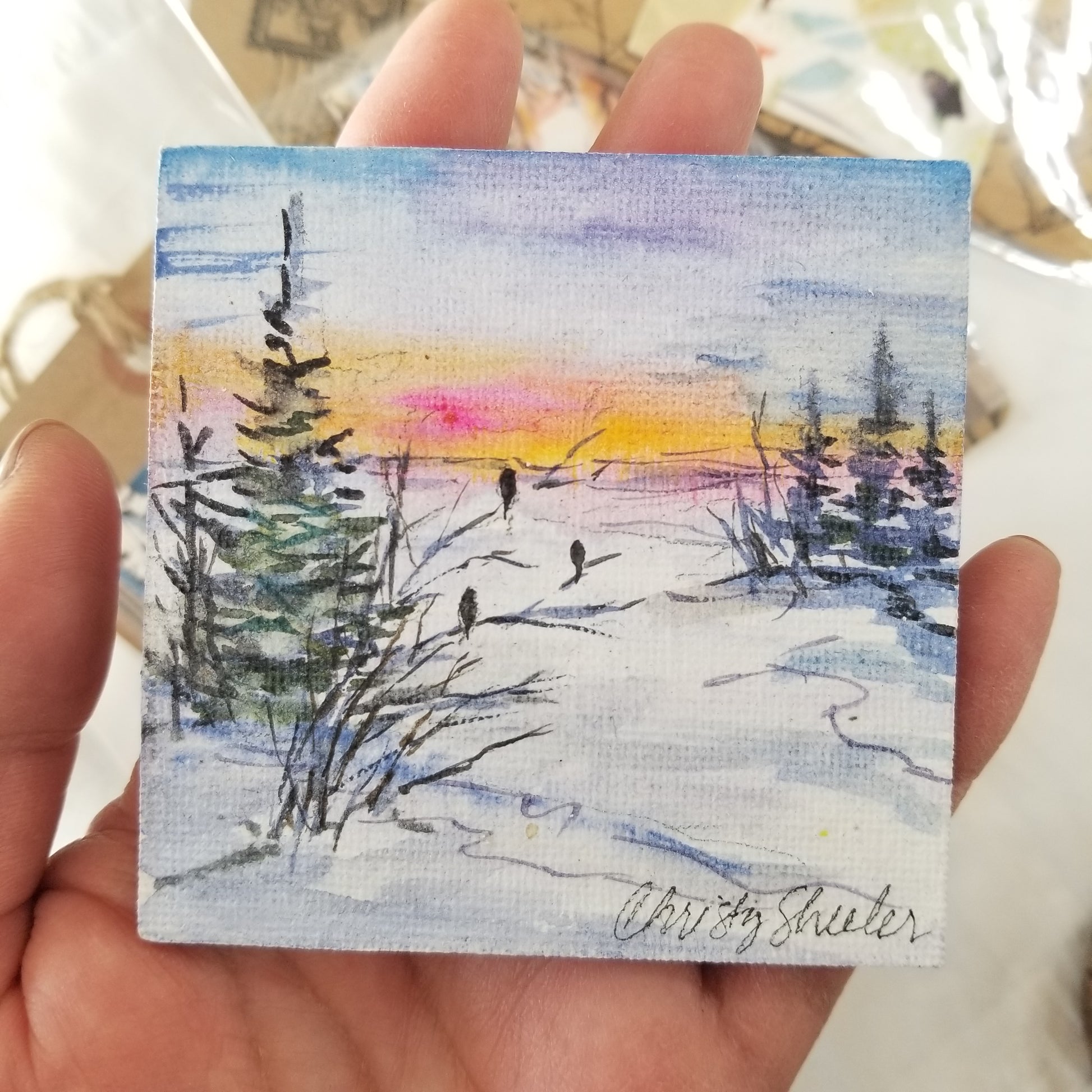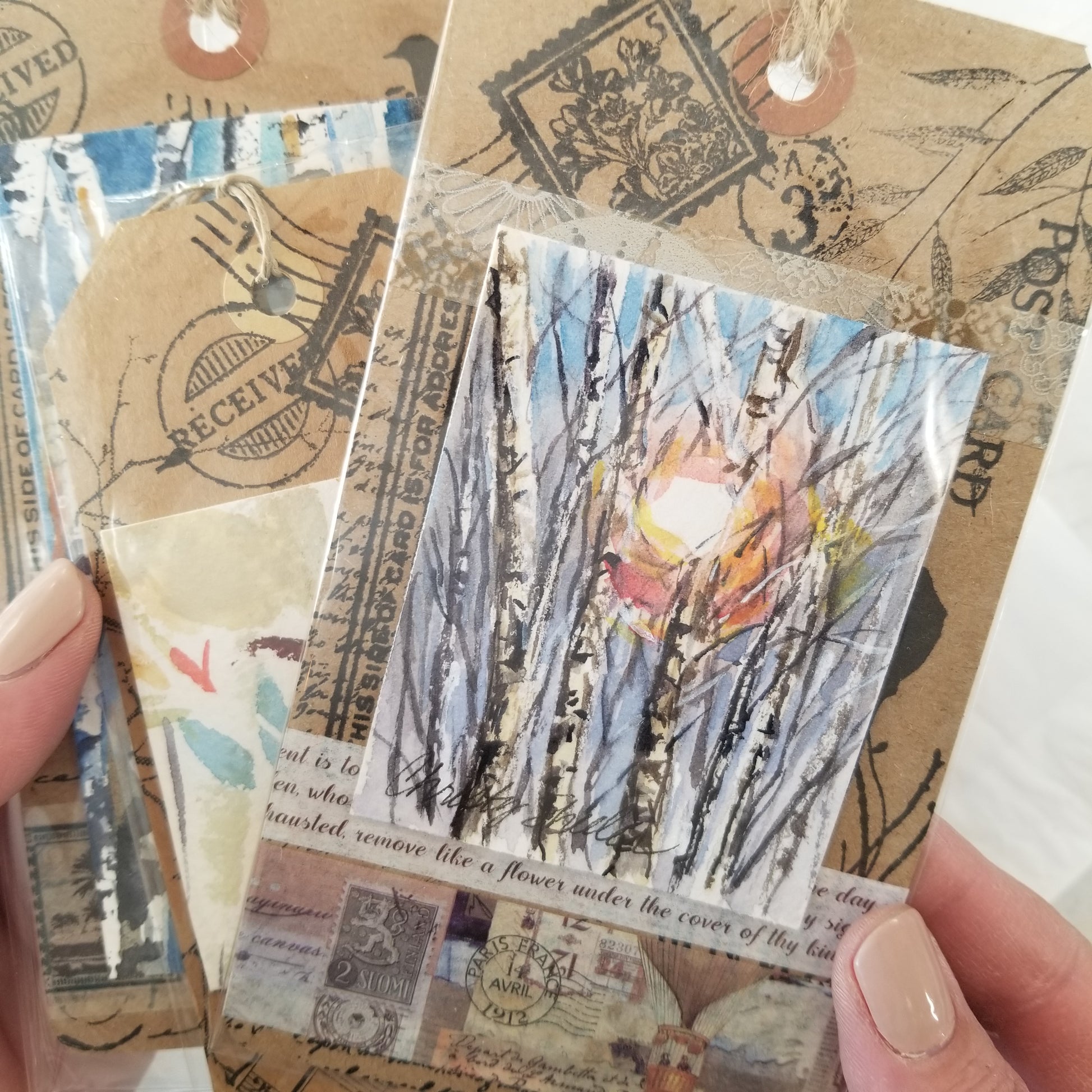 A selection of small watercolor extras each with an accent of watercolor painting. One 2.5" wood ornament painting of sunshine through trees with watercolors. One 3" magnet featuring a sunset landscape painted with watercolors. One medium bookmark with sampled swatches of watercolor as a mini abstract. Two large bookmarks with birch or aspen types of trees in winter. Bookmarks are stamped with an inspirational scripture on back. The ornament and magnet are sealed with cold wax to protect the artwork.