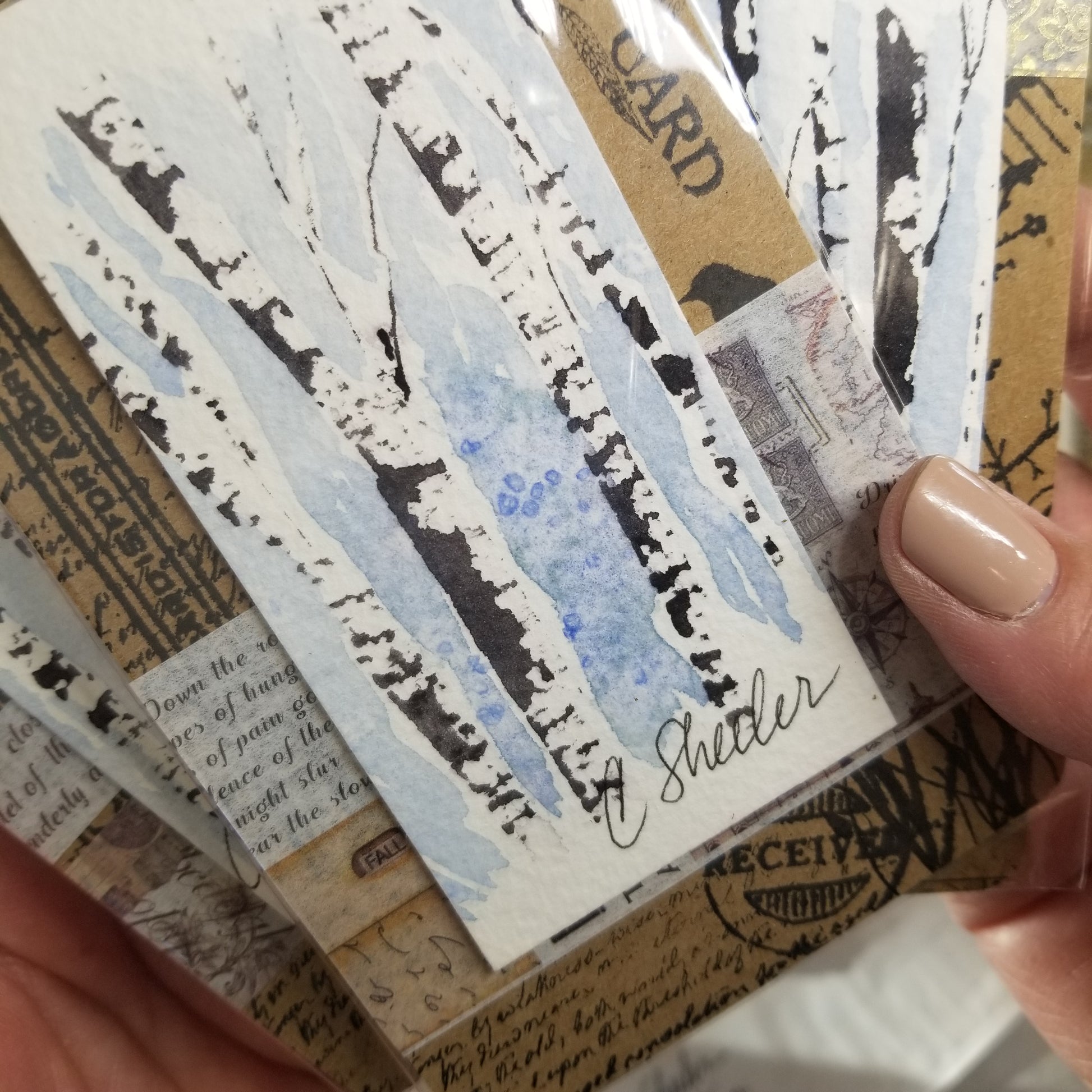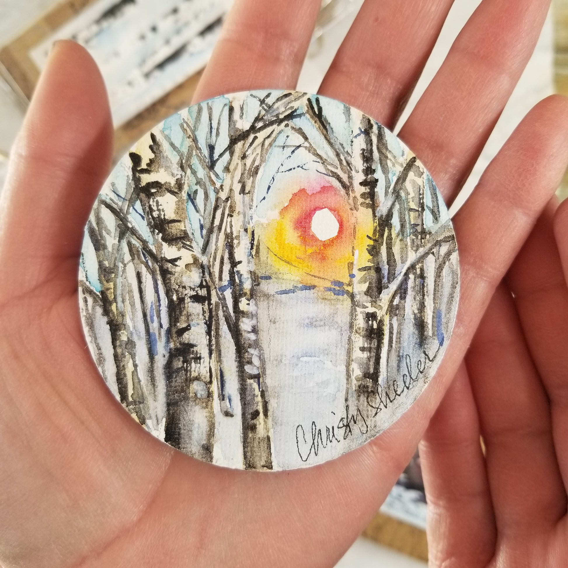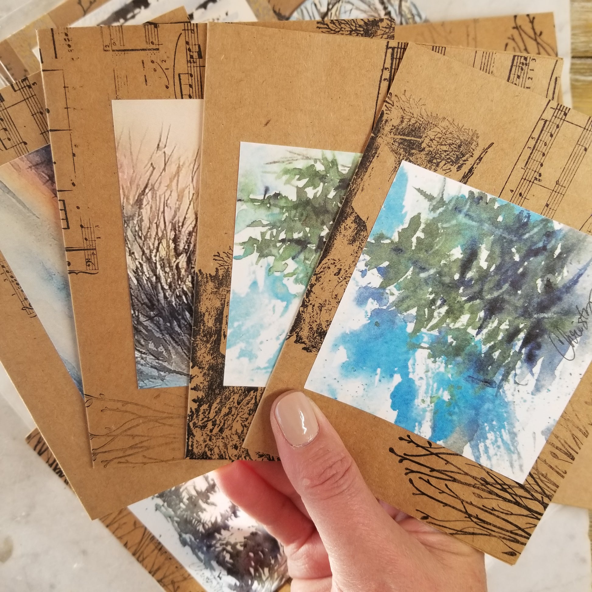 A selection of six items including a winter landscapes notecard set. One 2.5" wood ornament with watercolor painted scene of sunlight through trees. One 3" magnet watercolor painted scene of sunlight through trees. Three bookmarks, two large and one medium, with watercolor painted trees and pale blue background. One set of notecards with 8 different scenes; the images on notecards are miniature prints of my original watercolor artwork. The notecards are the only item in this bundle without original hand painted watercolor artwork. Bookmarks have inspirational scriptures stamped on back. Ornament and magnet have been sealed with cold wax to protect the artwork.