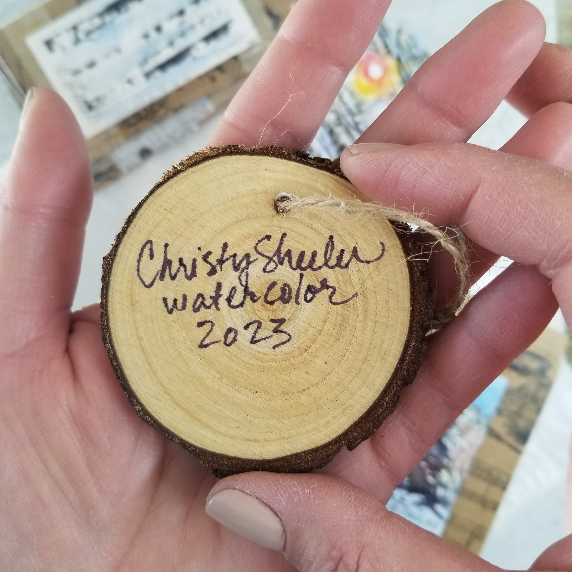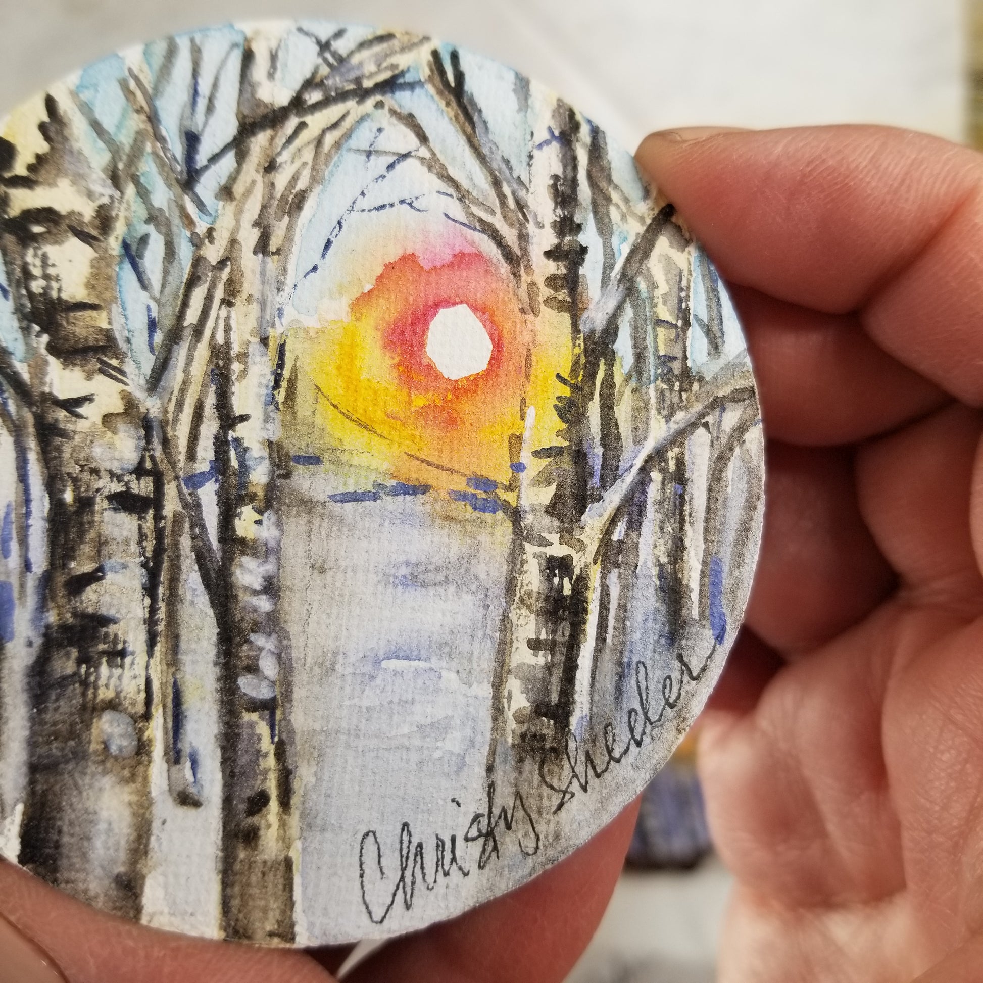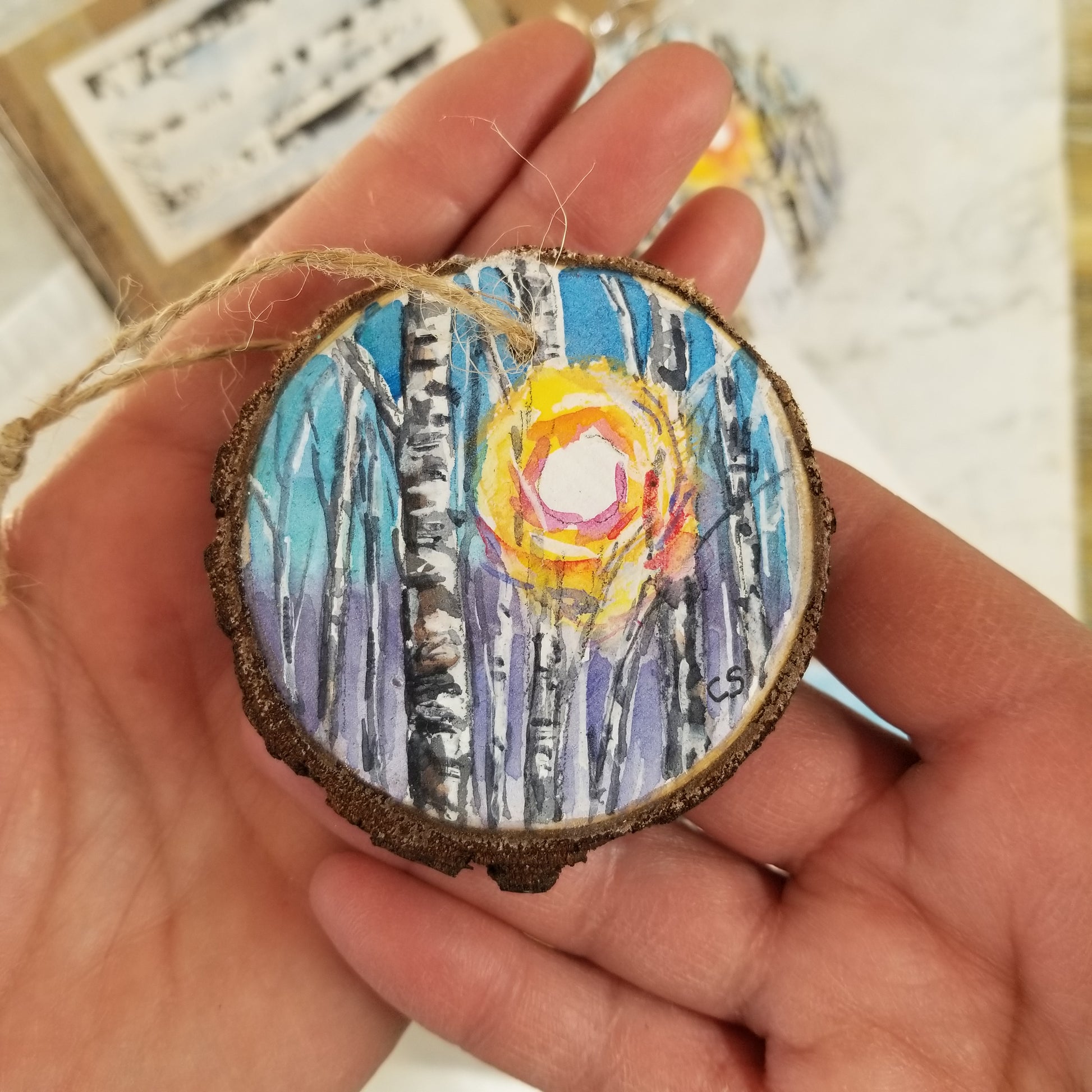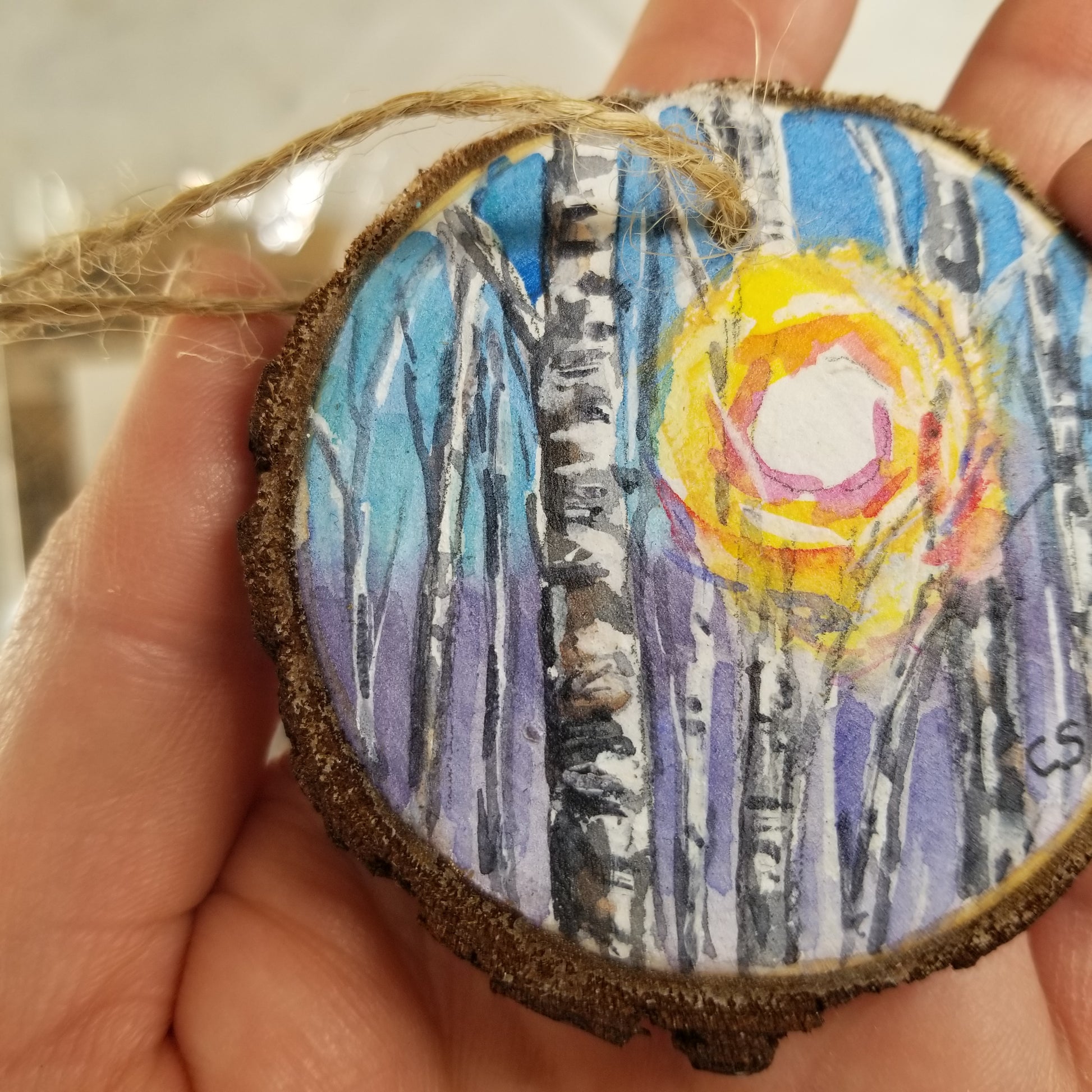 A selection of six items including a winter landscapes notecard set. One 2.5" wood ornament with watercolor painted scene of sunlight through trees. One 3" magnet watercolor painted scene of sunlight through trees. Three bookmarks, two large and one medium, with watercolor painted trees and pale blue background. One set of notecards with 8 different scenes; the images on notecards are miniature prints of my original watercolor artwork. The notecards are the only item in this bundle without original hand painted watercolor artwork. Bookmarks have inspirational scriptures stamped on back. Ornament and magnet have been sealed with cold wax to protect the artwork.