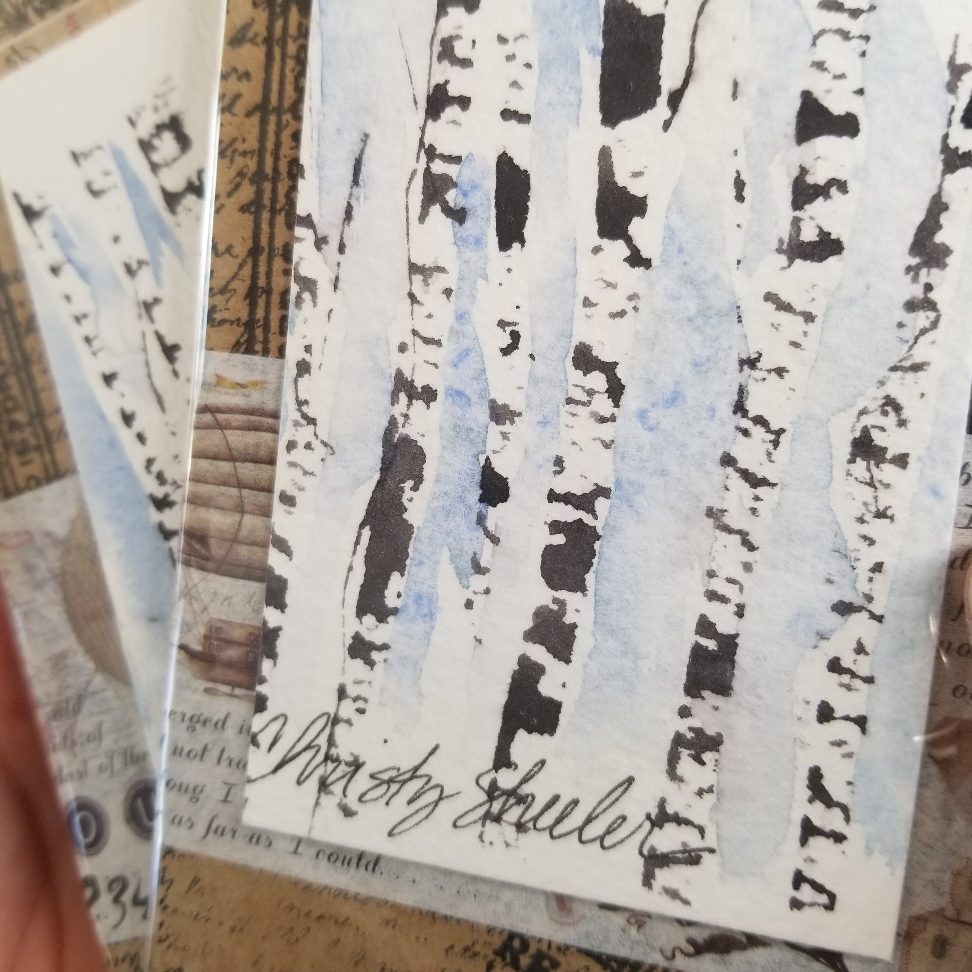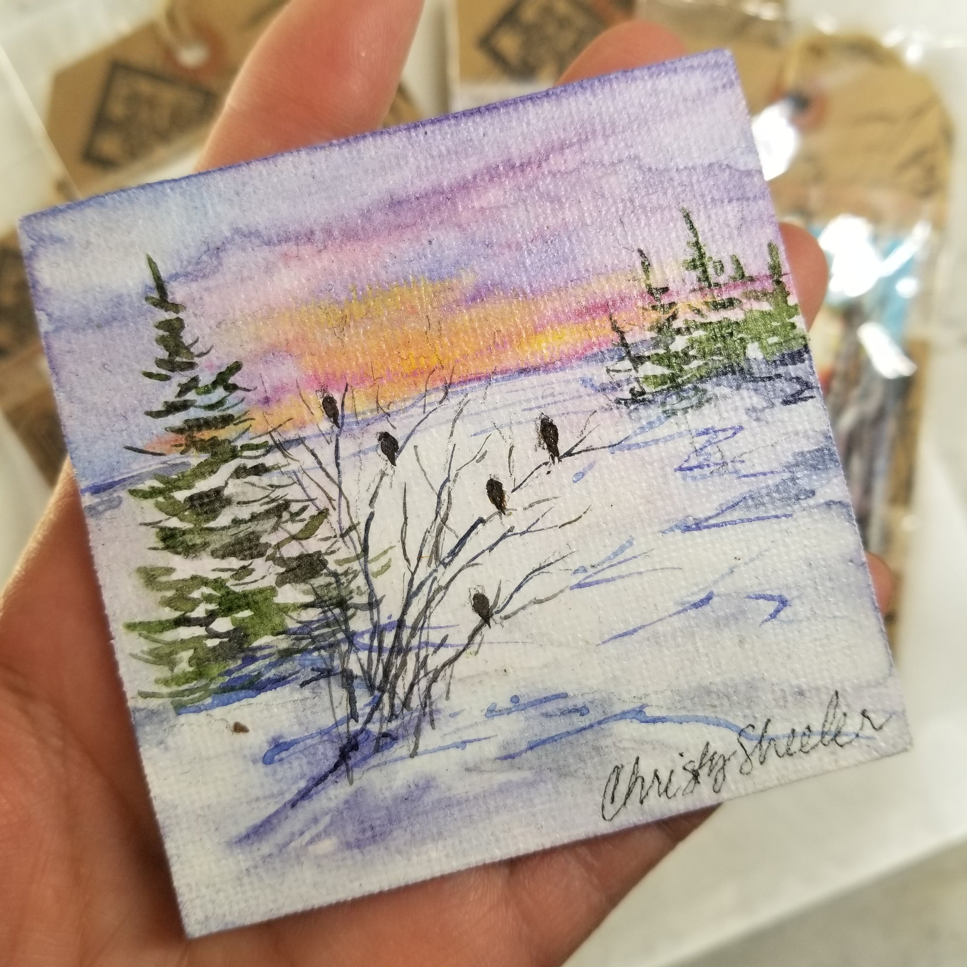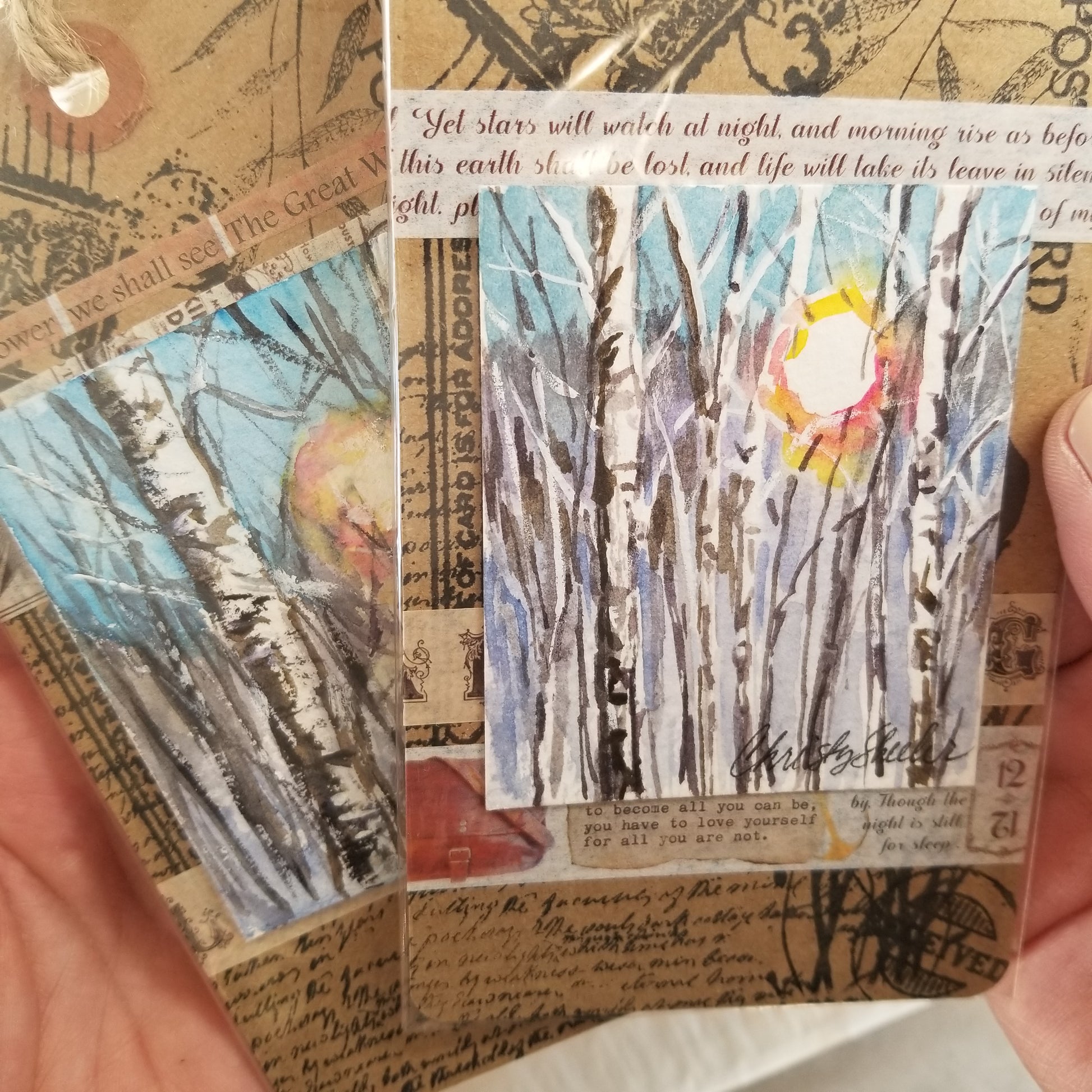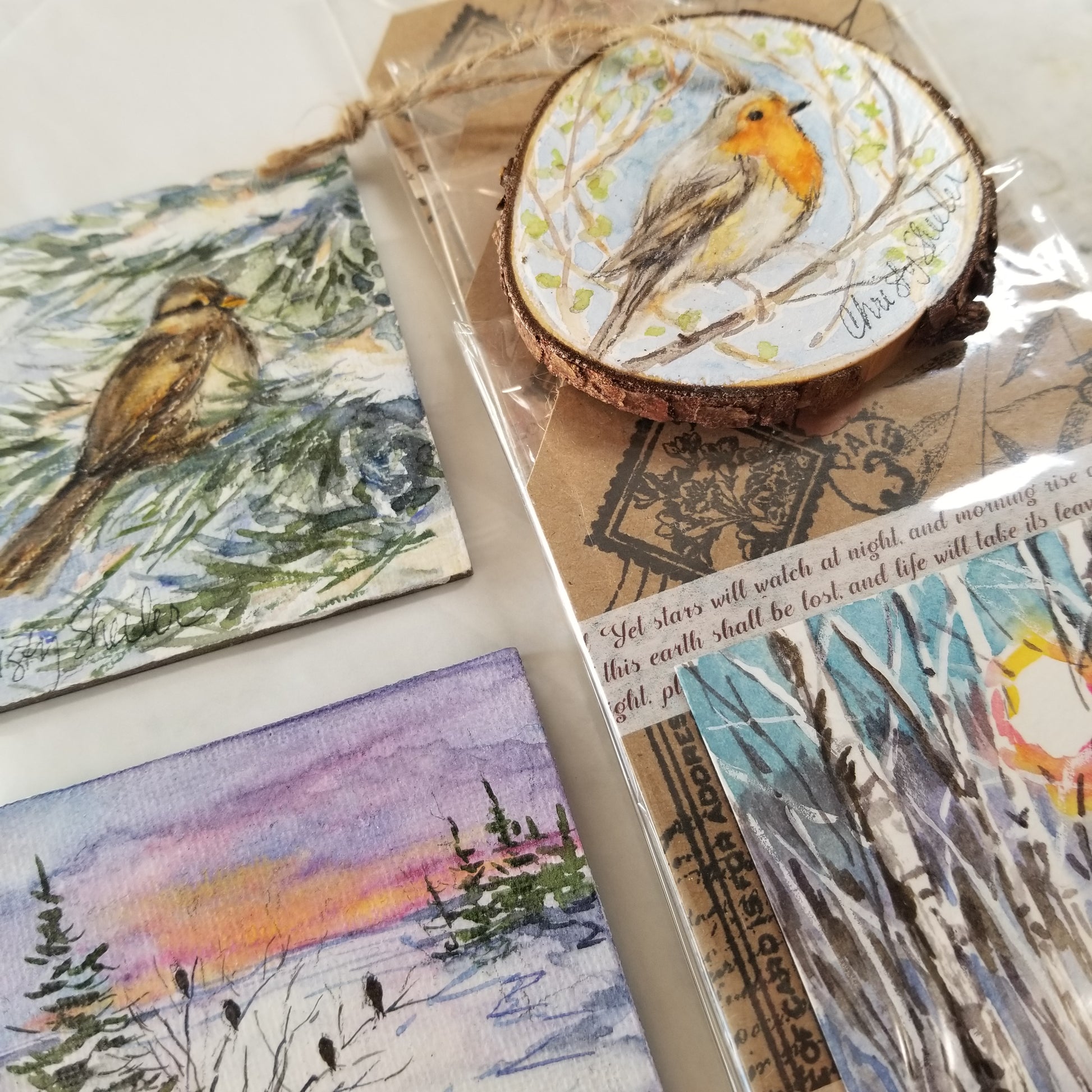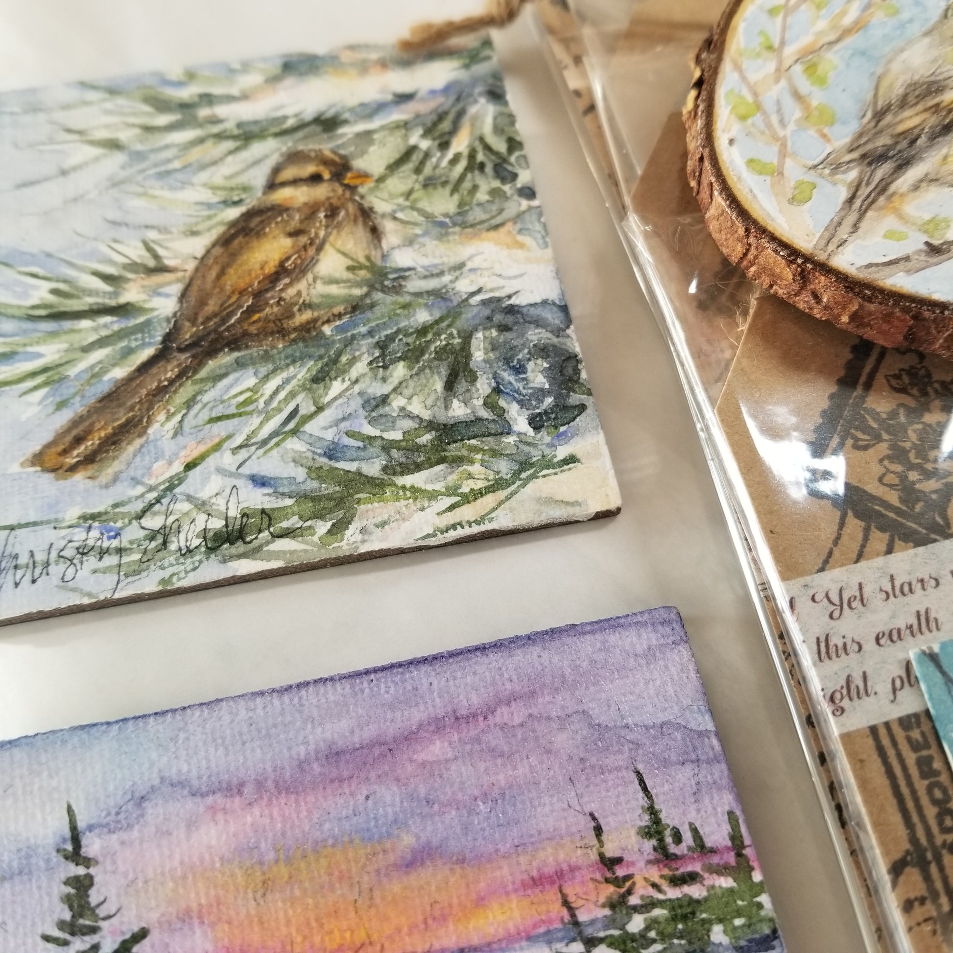 A selection of seven items all featuring hand painted watercolor artwork. One 2.5" wood ornament with a little robin. Two 3" magnets; one painting of a sparrow in a tree and one painting of a winter sunset with trees and birds. Four large 6" x 3.25" bookmarks with miniature watercolor artwork; two with sunlight through trees and two with black and white trees and a soft blue background. Back of bookmarks are stamped with an inspirational scripture verse. Ornament and magnets are sealed with cold wax to protect artwork.