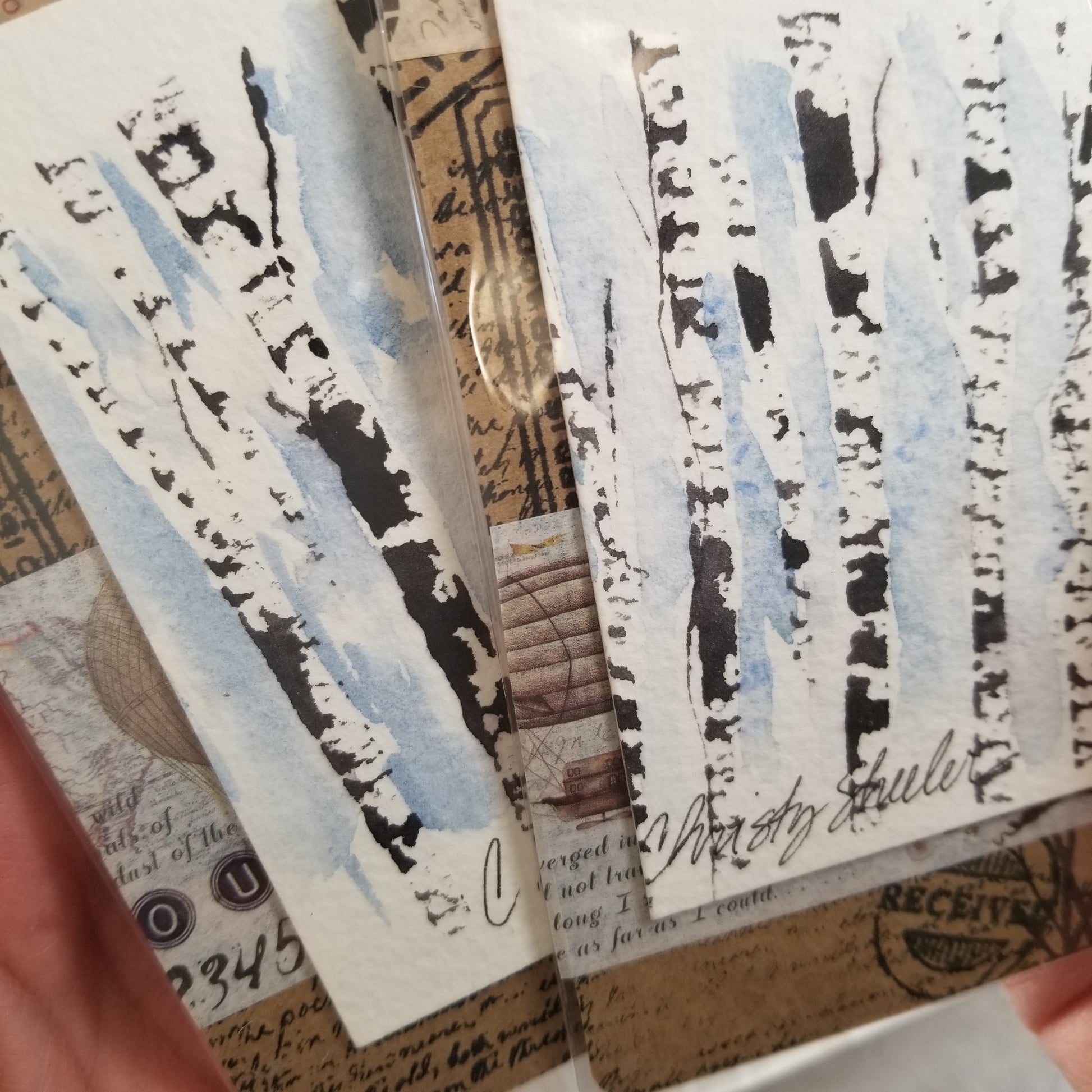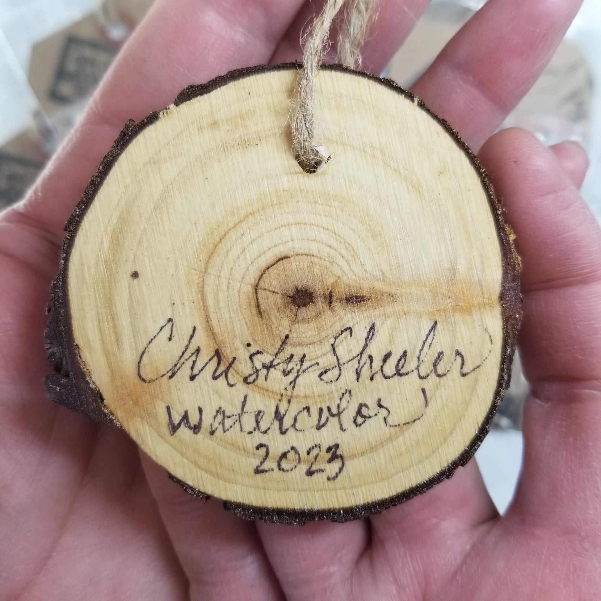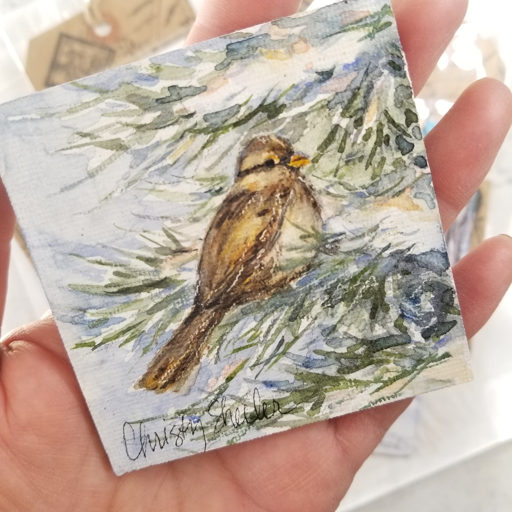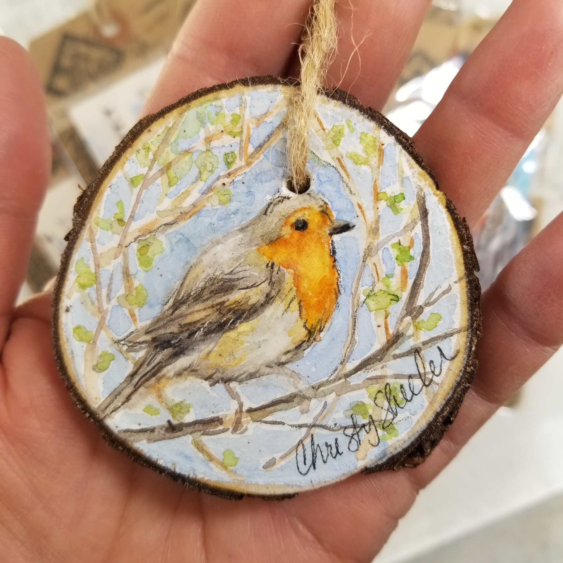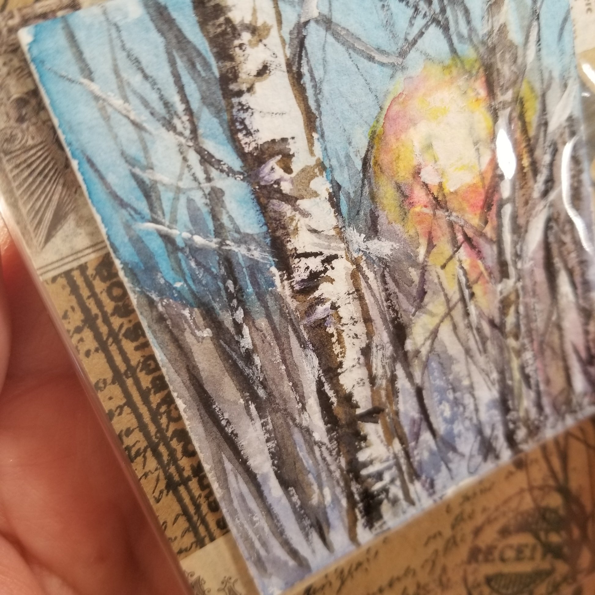 A selection of seven items all featuring hand painted watercolor artwork. One 2.5" wood ornament with a little robin. Two 3" magnets; one painting of a sparrow in a tree and one painting of a winter sunset with trees and birds. Four large 6" x 3.25" bookmarks with miniature watercolor artwork; two with sunlight through trees and two with black and white trees and a soft blue background. Back of bookmarks are stamped with an inspirational scripture verse. Ornament and magnets are sealed with cold wax to protect artwork.
